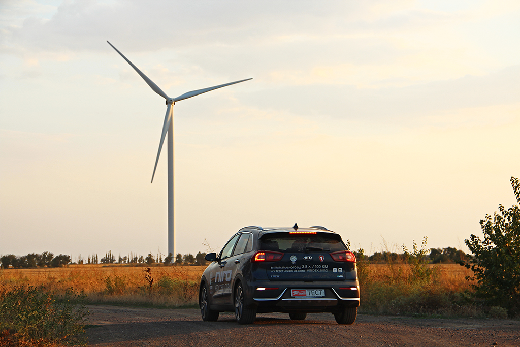 Очаковская станция действительно украинская, 2012 года, а не досталась в наследство от СССР, как многое другое. Четырнадцать ветряков общей мощностью 37,5 мегаватт установлены на расстоянии 500 м друг от друга. Каждый высотой 100 метров и плюс еще гондола с генератором, трансформатором и прочим оборудованием. Как и наш новый гибрид – Kia Niro, ветряк получает электрическую энергию практически из ниоткуда – от ветра. Даже когда на земле полный штиль, там, на 100 – метровой высоте, есть движение воздуха, который вращает трехлопастный вентилятор и выдает желанные киловатты.