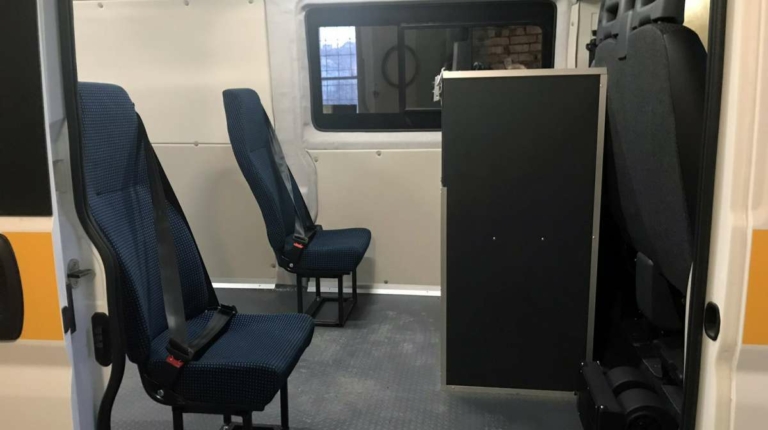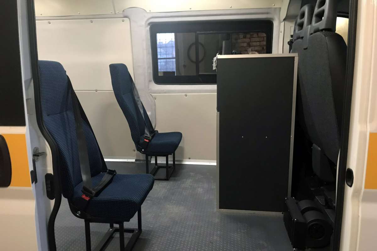 В кабине могут ехать еще 2 пассажира и водитель. Чтобы иметь возможность транспортировать пассажиров с учетом их ограниченных возможностей, в двух из четырех посадочных мест в самом салоне предусмотрены специальные крепления для инвалидных кресел-колясок.