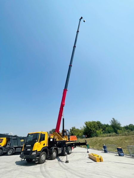 Высота многосекционной стрелы составляет 40,5 м, хотя вскоре на нее установят еще и «гусек» длиной 9 м. Что же касается шасси Scania P380, то как видно оно относится к семейству XT – для тяжелых условий эксплуатации, имеет колесную формулу 8х4, короткую кабину cерии P и оснащена 380-сильным турбодизелем. Представленный на фото автокран уже передан клиенту – это первая из трех заказанных машин.