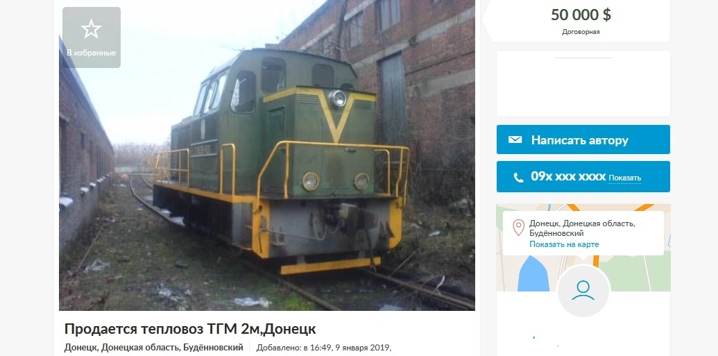 Вот только купить и вывезти ТГМ-2М будет не так-то просто. Тепловоз находится на временно оккупированной территории, в Донецке. Более того, он не на рельсах, так что потребуется помощь автокрана и специального транспорта.