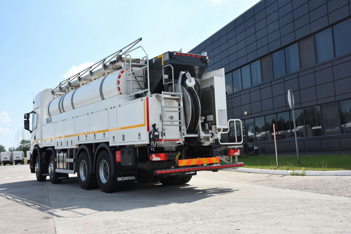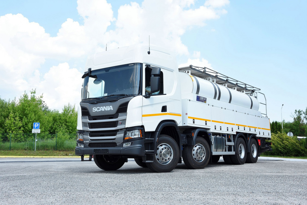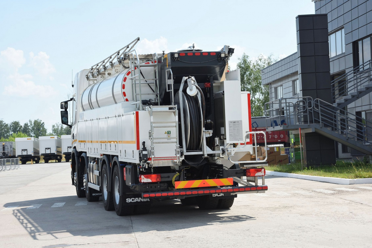 С первого взгляда и не скажешь, что этот четырехосный грузовик Scania, напоминающий автотопливозаправщик, стоит ни много ни мало один миллион евро. Все дело в специальной надстройке, установленной на шасси G440B8x4HZ Евро 5 ADR EX/3.