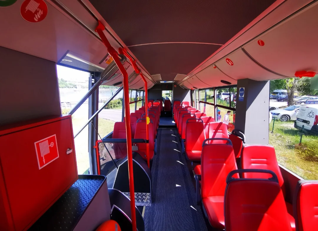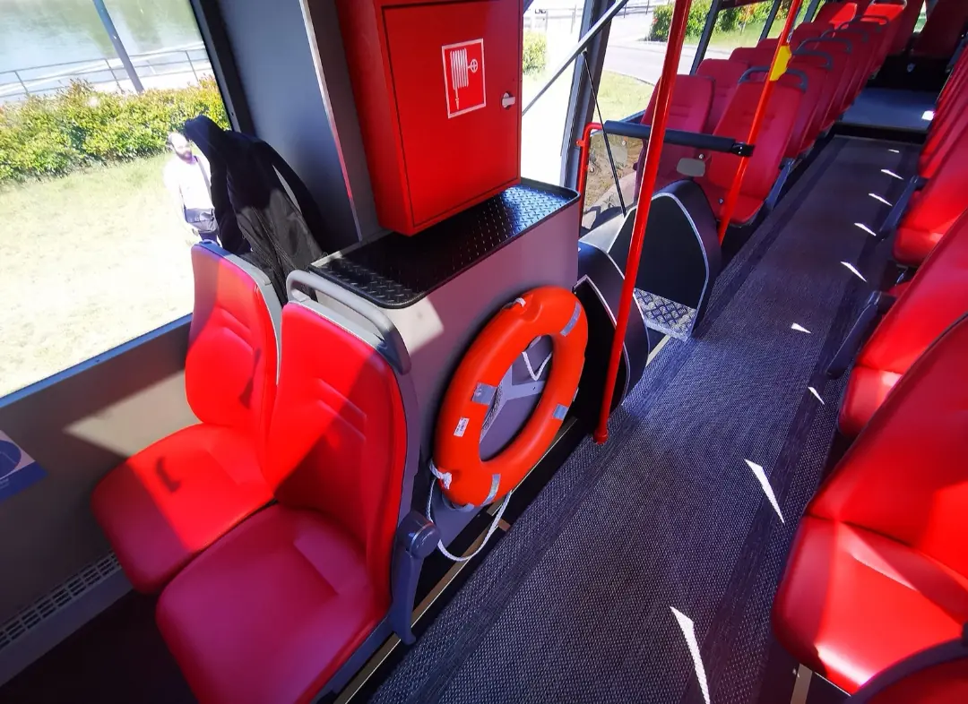 Внешние размеры соотвествуют среднему междугороднему автобусу: длина - 12 070 мм, ширина - 2540 мм и высота- 3750 мм. Интересно, что по документам Swimbus относится к городским автобусам класс M3 / I, хотя перевозит только сидящих пассажиров – для них в салоне установлены 45 кресел. Кстати, теперь под каждым сиденьем имеется спасательные жилет, на первом автобусе все они находились в общем шкафу.