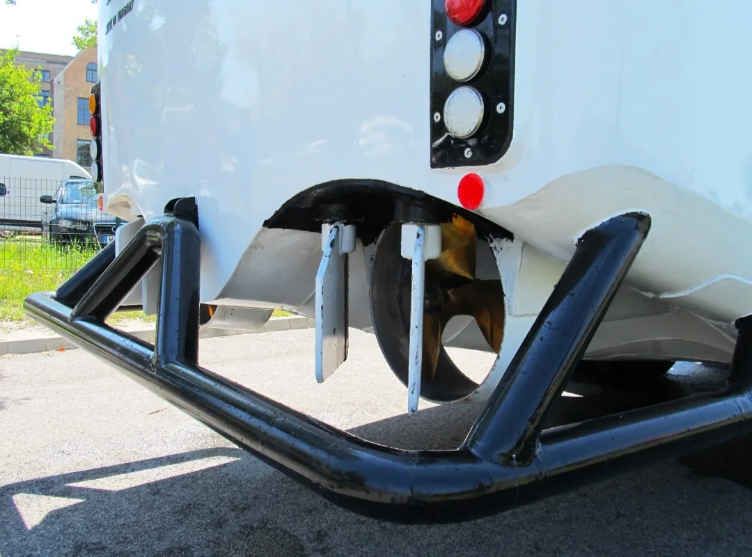 При разработке амфибии безопасность была приоритетом номер. За работу на воде отвечают два двигателя со своим рулевым управлением, что гарантирует сохранение подвижности при выходе из строя одного из них. Корпус разделен на 18 водонепроницаемых отсеков, каждый со своим датчиком утечки воды и насосом. Двери расположены довольно высоко от земли, учитывая максимальную осадку транспортного средства в 1040 мм.