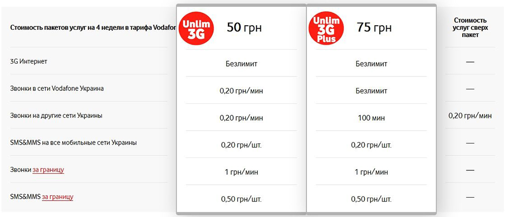 Линейка Unlim 3G включает два тарифа: Vodafone Unlim 3G стоимостью 50 грн и Vodafone Unlim 3G Plus стоимостью 75 грн за 4 недели использования. В Vodafone Unlim 3G в абонентскую плату входит безлимитный доступ к скоростному мобильному интернету. Стоимость SMS и минуты на звонки на все украинские номера, включая сеть Vodafone, составит 0,20 грн, звонки за границу в тарифе стоят от 1 грн/мин. Пакет Unlim 3G Plus включает, кроме интернета, безлимитные звонки внутри сети, а также 100 минут для звонков на другие сети.