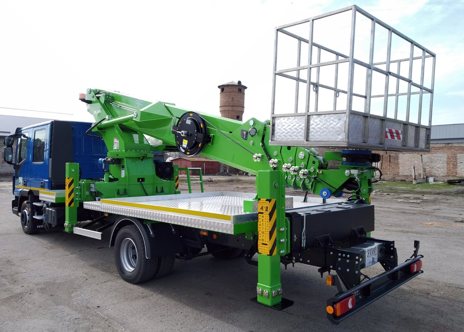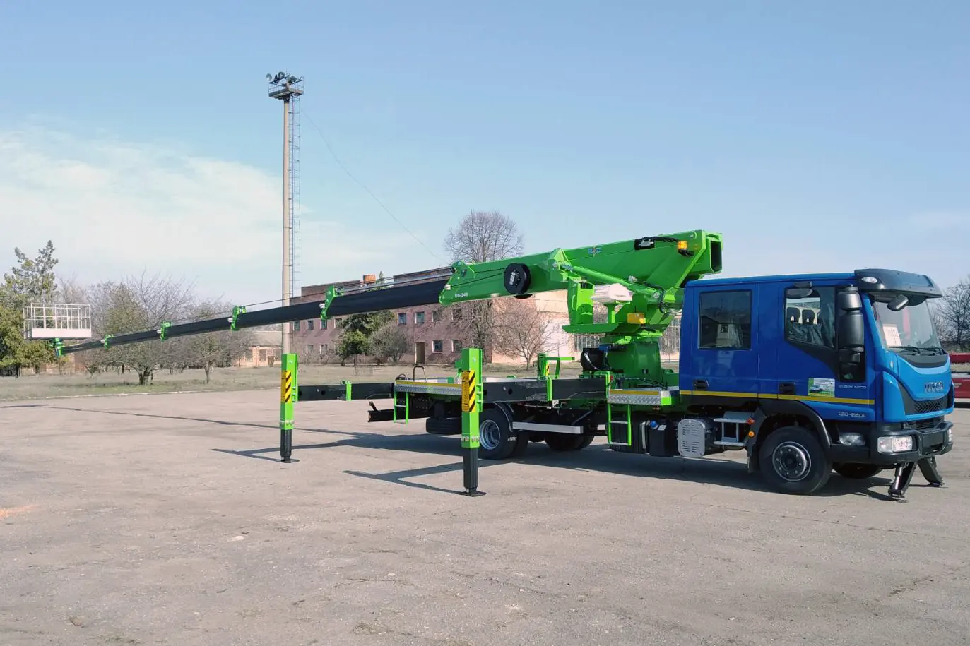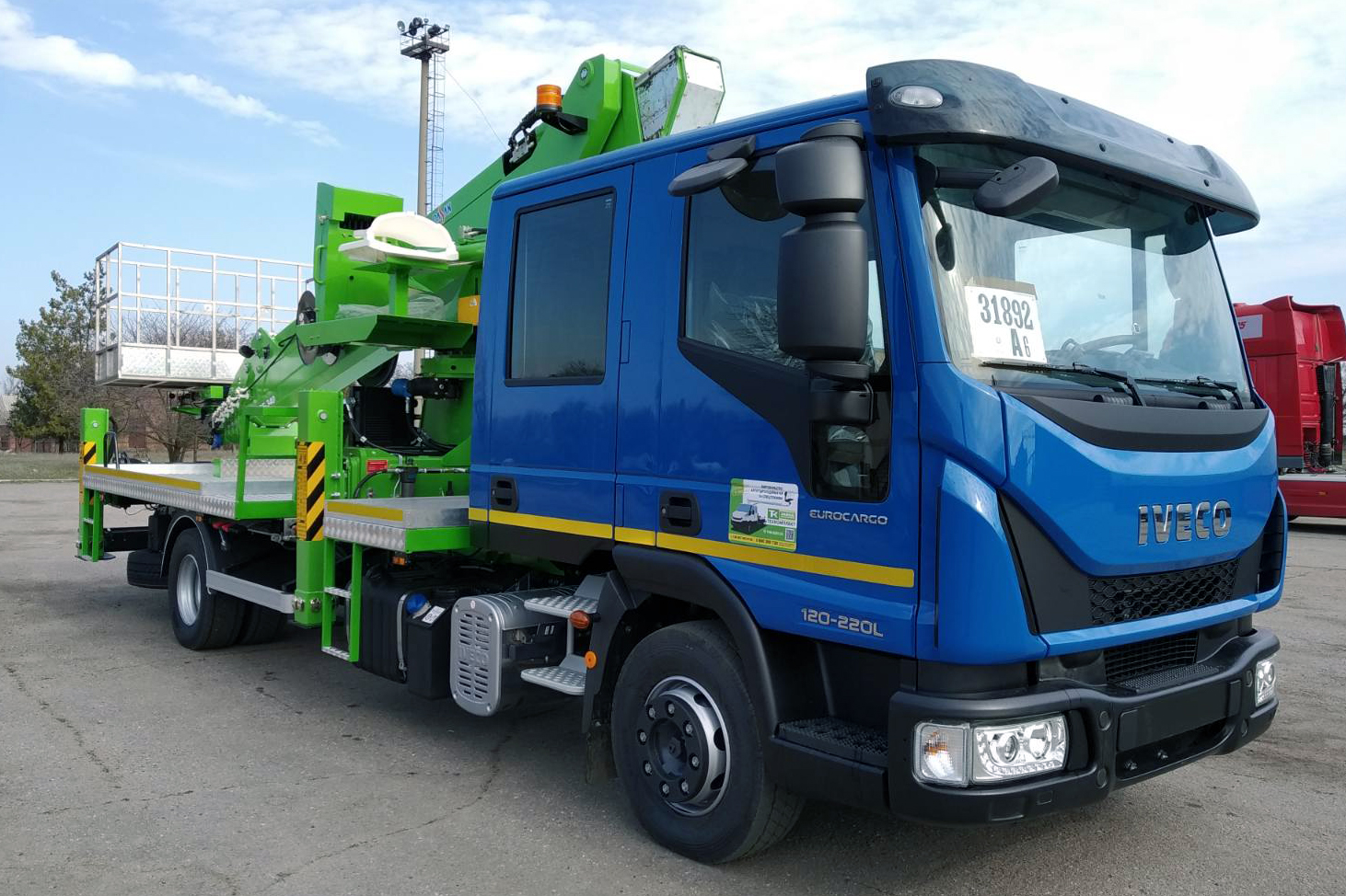 В качестве базовой машины клиент выбрал итальянское грузовое шасси IVECO EUROCARGO ML120E22 с MLD-кабиной удлиненного типа с двумя рядами пассажирских сидений. Вместительная экипажная кабина сможет перевезти бригаду работников численностью 7 человек, включая водителя. Полная масса шасси 12 т (грузоподъемность 7,6 т), двигатель 5,9 л 220 л.с. Е-5, колесная база 4815 мм.