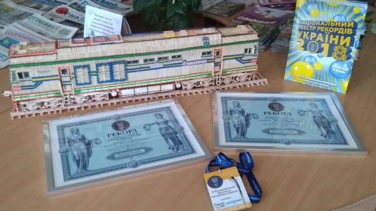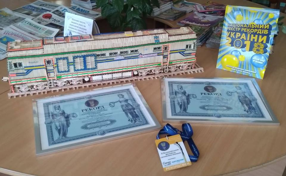 И труд моделиста был оценен по достоинству. Работа занесена в книгу Национальный Реестр Рекордов Украины и получила сразу два диплома. Первый – как самая большая модель тепловоза с вагонами. И второй диплом – как самый большой локомотив с вагоном, сделанные из спичек. Кстати, 4 марта отмечается День коллекционера масштабных моделей. Поэтому от души поздравляем с этим светлым праздником рекордсмена и всех, кто неравнодушен к уникальному миру в миниатюре.
