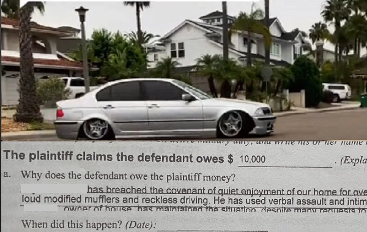 На любителя скорости и автомобилей BMW подали в суд, обвинив его в невозможности наслаждаться тихим времяпрепровождением дома. Причиной тому послужила чрезмерная любовь мужчины к немецким автомобилям. Громкий рык мотора и безрассудное вождение вынудили соседей не только подать иск в суд, но еще и потребовать компенсацию в размере более 10 тысяч долларов. Судя по всему, у истцов были веские доводы, поскольку судья поставил точку в этом деле и вынес решение в их пользу.