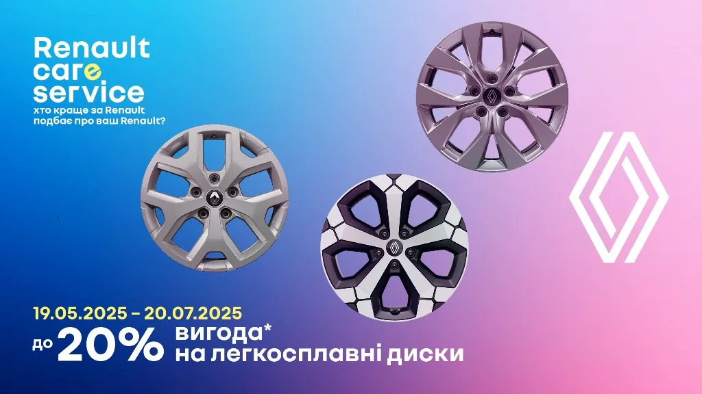 * Під вигодою/знижкою мається на увазі знижки до 20% від рекомендованої роздрібної ціни на легкосплавні диски для автомобілів Renault /Dacia. Розмір знижки є рекомендованим. Перевірити належність деталі до акційного асортименту, звичайну рекомендовану роздрібну вартість (до надання знижки) та акційну рекомендовану роздрібну вартість за артикульним номером запасної частини можна на сайті: www.parts.renault.ua Зазначені розміри знижок, акційна роздрібна вартість є рекомендованими та можуть відрізнятись у різних дилерських центрах. Про встановлені дилерами знижки та остаточну акційну вартість дізнавайтесь безпосередньо в дилерських центрах офіційної дилерської мережі Renault. Пропозиція діє з 19.05.2025 по 20.07.2025. виключно в офіційній дилерській мережі Renault на всій території України, за винятком тимчасово окупованих територій та територій, на яких державні органи України тимчасово не здійснюють свої повноваження (території, що перебувають в оточенні (блокуванні)) та/або території на яких тривають активні бойові дії внаслідок збройної агресії Російської федерації проти України.