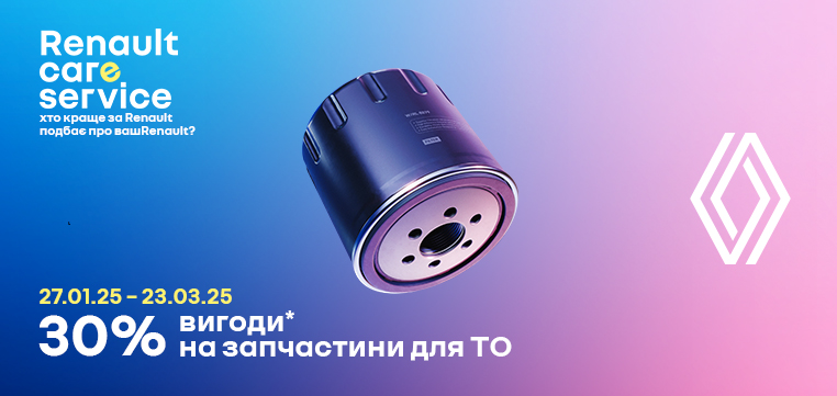 *Під вигодою/знижкою/спеціальний мається на увазі знижки до 30% від рекомендованої роздрібної ціни на запчастини для технічного обслуговування автомобілів Renault /Dacia та знижка до 10% на роботи з їх заміни. Знижки на запчастини та оливи надаються за умови їх встановлення в офіційному дилерському центрі Renault у період дії Акції. Розмір знижки є рекомендованим. Перевірити належність деталі до акційного асортименту, звичайну рекомендовану роздрібну вартість (до надання знижки) та акційну рекомендовану роздрібну вартість за артикульним номером запасної частини можна на сайті: www.parts.renault.ua