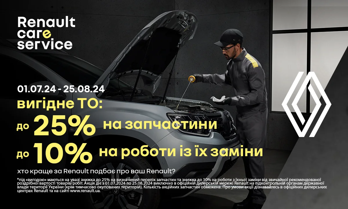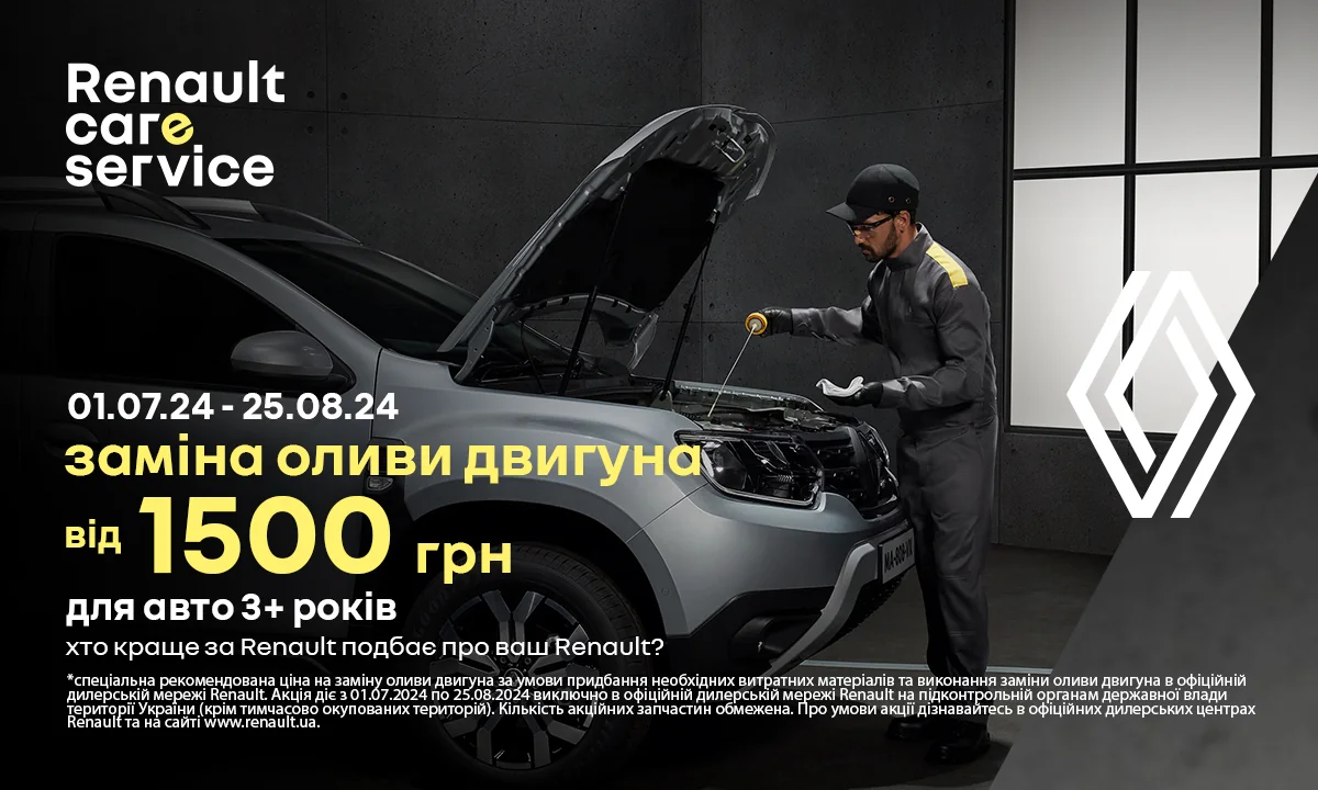 Роботи по заміні оливи двигуна включають злив відпрацьованої оливи та заправку нової оливи із встановленням фільтра оливи та ущільнюючого кільця зливної пробки. У випадку необхідності до вказаної вартості може бути додана вартість послуги із зняття/встановлення захисту піддону картера двигуна, про що дилер зобов'язаний попередити учасника акції до початка виконання робіт. Пропозиція діє з 01.07.2024 до 25.08.2024р. виключно в офіційній дилерській мережі Renault на підконтрольній українським органам державної влади території України (крім тимчасово окупованих територій). Кількість акційних запчастин обмежена. Знижки за програмою лояльності «Вік має значення» не додаються і не підсумовуються до знижок за іншими сервісними акціями, що проводяться в офіційній дилерській мережі Renault.