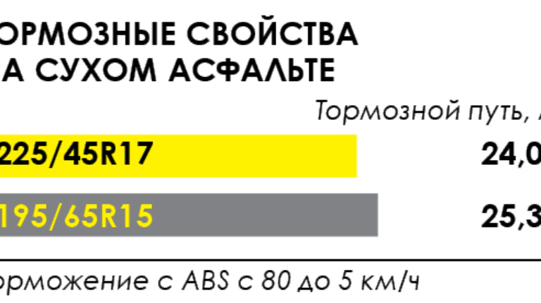 При резких маневрах наблюдается заметно больший снос, а в затяжной дуге отчетливо чувствуется, что шина сильно подламывается и начинает «плыть» наружу виража. Момент начала сноса менее выразительный, но при этом автомобиль можно легко контролировать и стабилизировать. Выигрывает шина 225/45R17 на мокром асфальте также и по тормозным свойствам. При торможении с 80 км/ч тормозной путь здесь короче почти на один метр (см. графики).