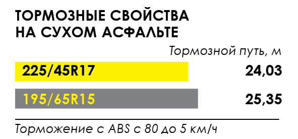 На шинах 225/45R17 автомобиль реагирует на команды водителя значительно точнее. Но если уж превысили разумную скорость, то появляется большой снос и сложности с возвратом на свою полосу. На меньших скоростях склонность к сносам и заносам на 17-дюймовой шине равноценные. На сухом асфальте шина 225/45R17 также лучше тормозит: остановочный путь короче более чем на 1 м (см. графики).