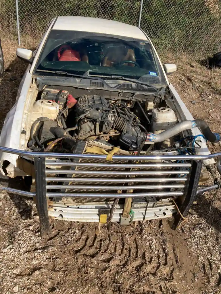 Но еще более интересен автомобиль, на котором он их совершил. На фото - изуродованный Ford Mustang. У культового маслкара нет ни капота, ни переднего бампера. Из моторного отсека выглядывает 3,7-литровый V6 с нетрадиционной системой впуска холодного воздуха. Переднюю часть кузова «защищает» трубчатый «кенгурятник», прикрепленный веревками и ремнями. На снимке сбоку видны вмятины на кузове, причем сразу в нескольких местах.