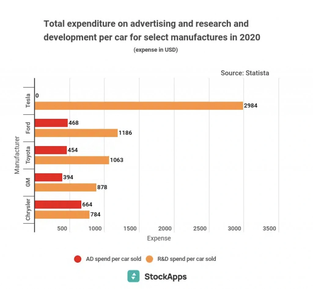 Tesla тратит на исследования и разработки больше, чем любой другой автопроизводитель. В 2020 году в перерасчете на один произведенный автомобиль компания потратила $2984. Например, затраты Ford в том же году составили $1186 долларов, Toyota — $1063, GM — $878, Chrysler — $784. В среднем по отрасли этот показатель составляет $1000.