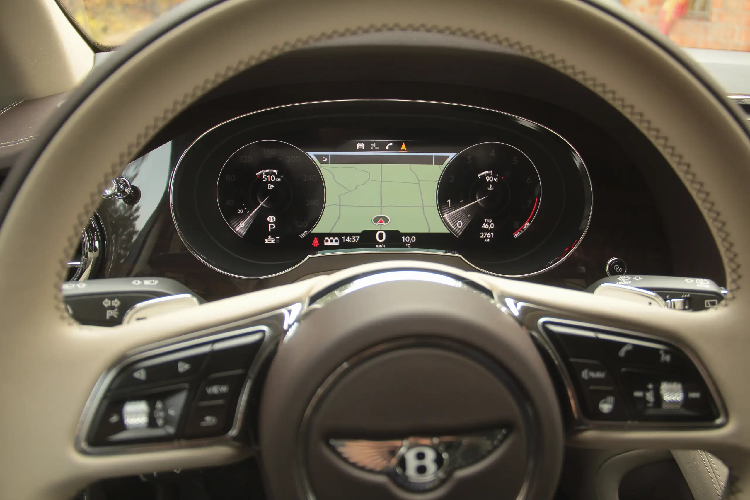 Крутишь регулировку громкости и наслаждаешься звучанием аудиосистемы Naim на 20 динамиков мощностью 1800 Ватт. И во всем этом великолепии, глядя на новые, стилизованные под букву B центральные дефлекторы обдува, ты начинаешь ощущать спокойствие и умиротворение. За рулем Bentley Bentayga приятно ехать размеренно и не спеша, получая наслаждение от спокойной, уверенной езды. Такие же ощущения и на заднем ряду, к тому же здесь и просторно и есть свои настройки микроклимата. Но все же за рулем интереснее, потому что как не проверить динамические качества этого кроссовера? Под капотом первых версий, а тестовая машина это именно First Edition, установлен V8 объемом 4 литра и мощностью 550 л.с. Его весьма внушительный крутящий момент в 770 Н/м доступен уже с 2 тысяч оборотов (даже чуть раньше), что наделяет автомобиль отличнейшей динамикой. А теперь сравним цифры с тему, что в начале статьи. 4,5 секунды до “сотни”, как вам? Да, на 0,4 секунды медленнее, но их вряд ли почувствует водитель.