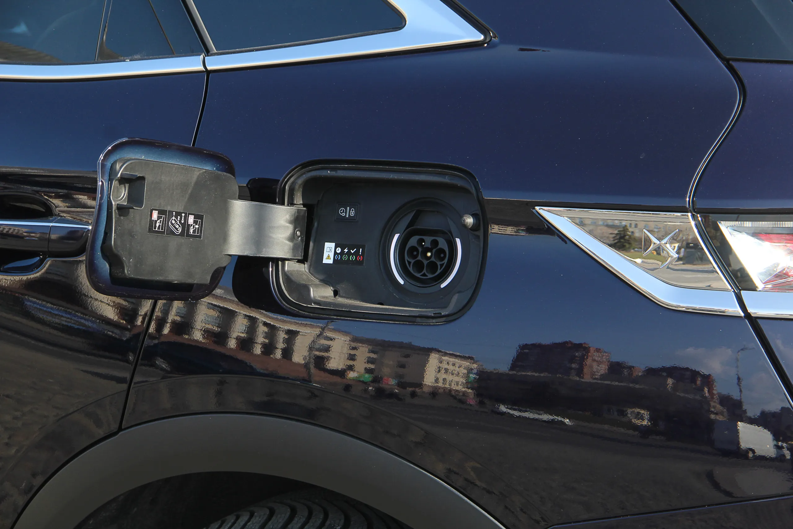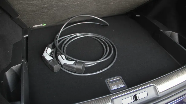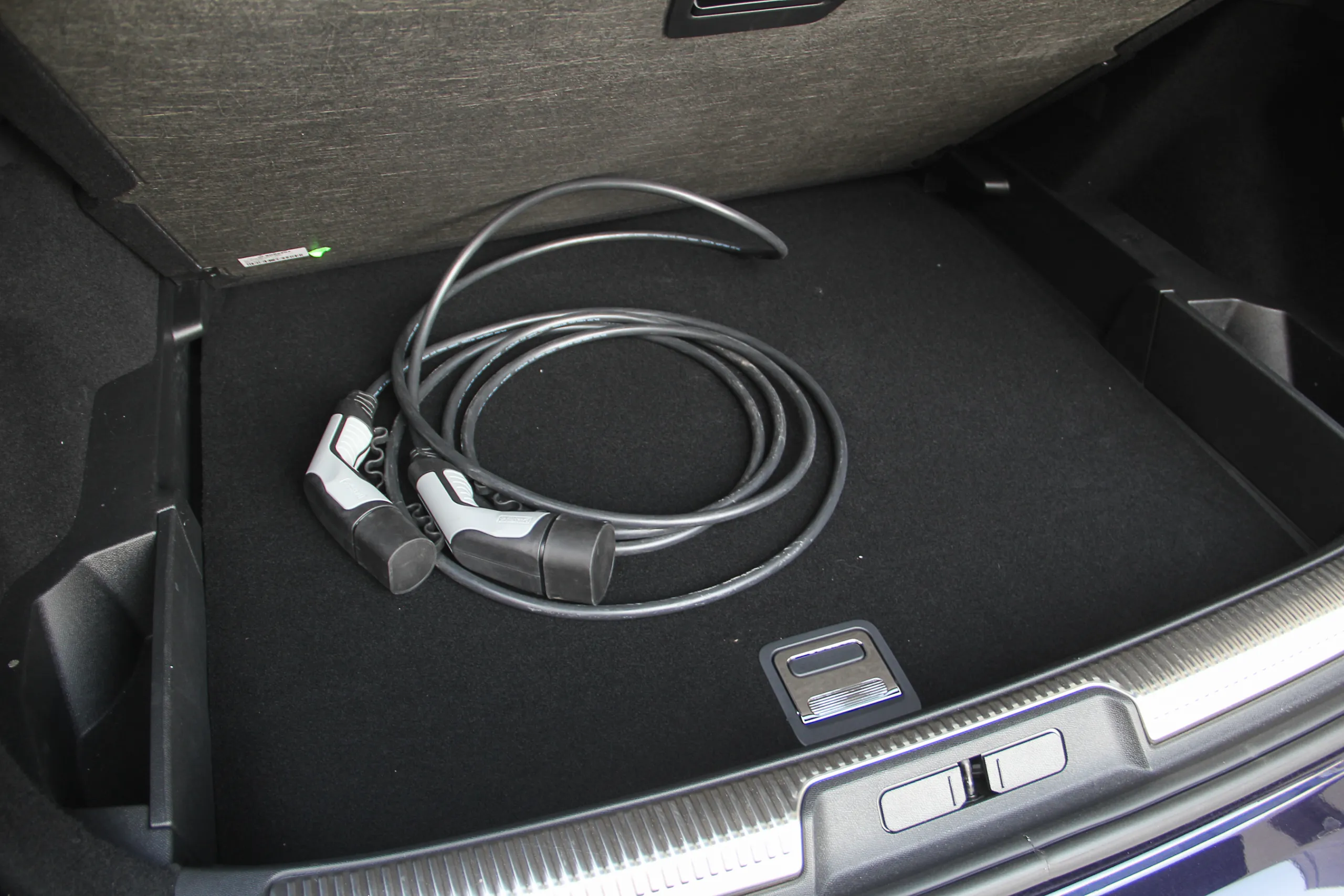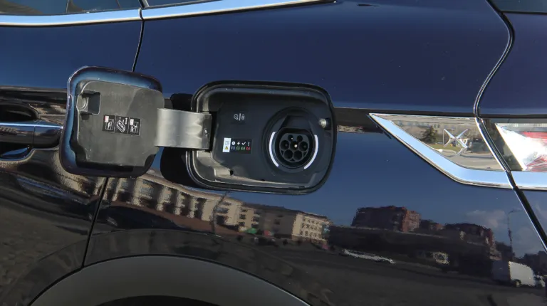За вторым лючком скрывается разъем Type 2, и такое его расположение вполне удобно для использования. Отмечу также, что низ кузова окаймлен пластиковой накладкой, что довольно практично, но может контрастировать с ярким цветом кузова. Впрочем, тестовый автомобиль щеголял благородным глубоким синим цветом, так что это было незаметно.