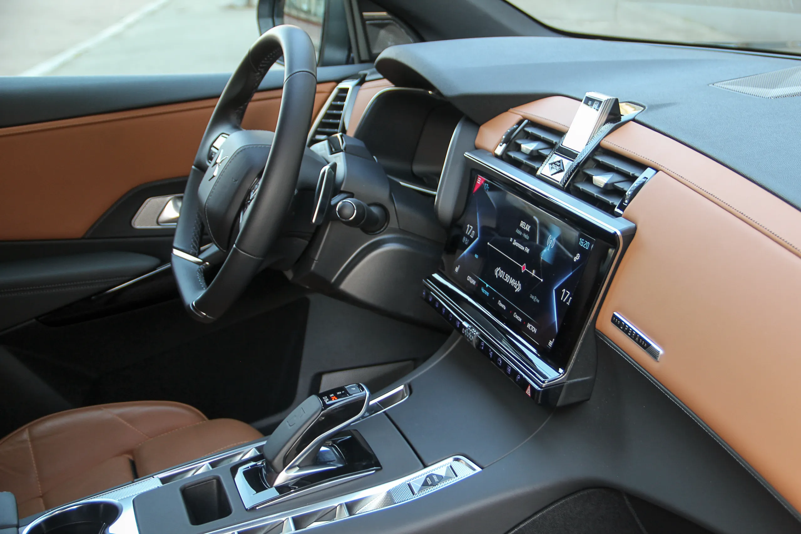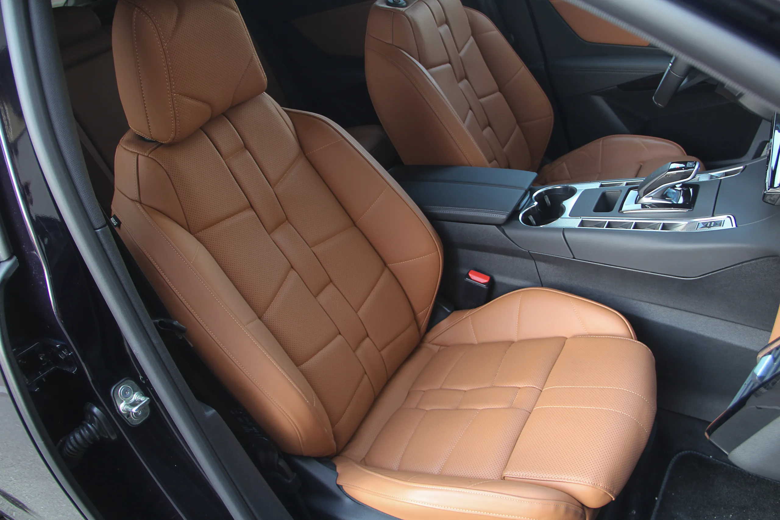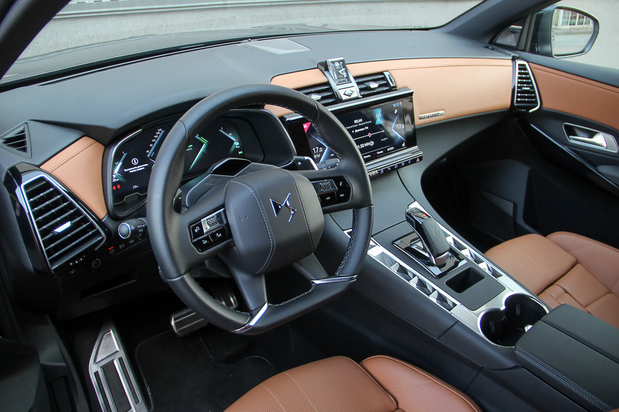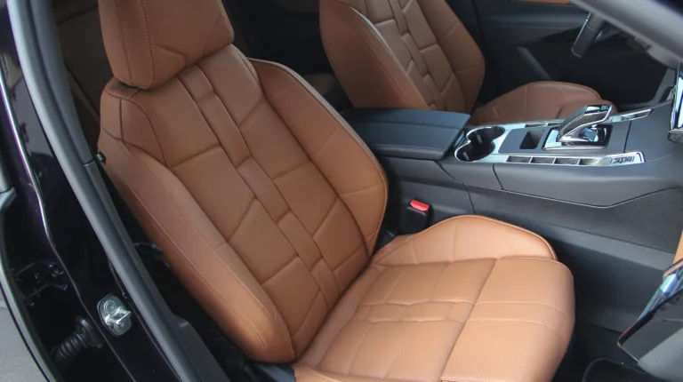 Тестовый DS 7 Crossback был в максимальной комплектации Grand Shic, к тому же еще и с некоторыми опциями (да-да, у вас всегда есть возможность дозаказать себе что-нибудь еще), поэтому в салоне выглядел очень нарядно. Светло-коричневой кожей наппа с перфорацией и фактурным пошивом (стилистически напоминает ремешок часов) отделаны не только сидения, но и частично передняя панель и дверные карты. На центральной консоли доминируют темные оттенки и это также преимущественно кожа.