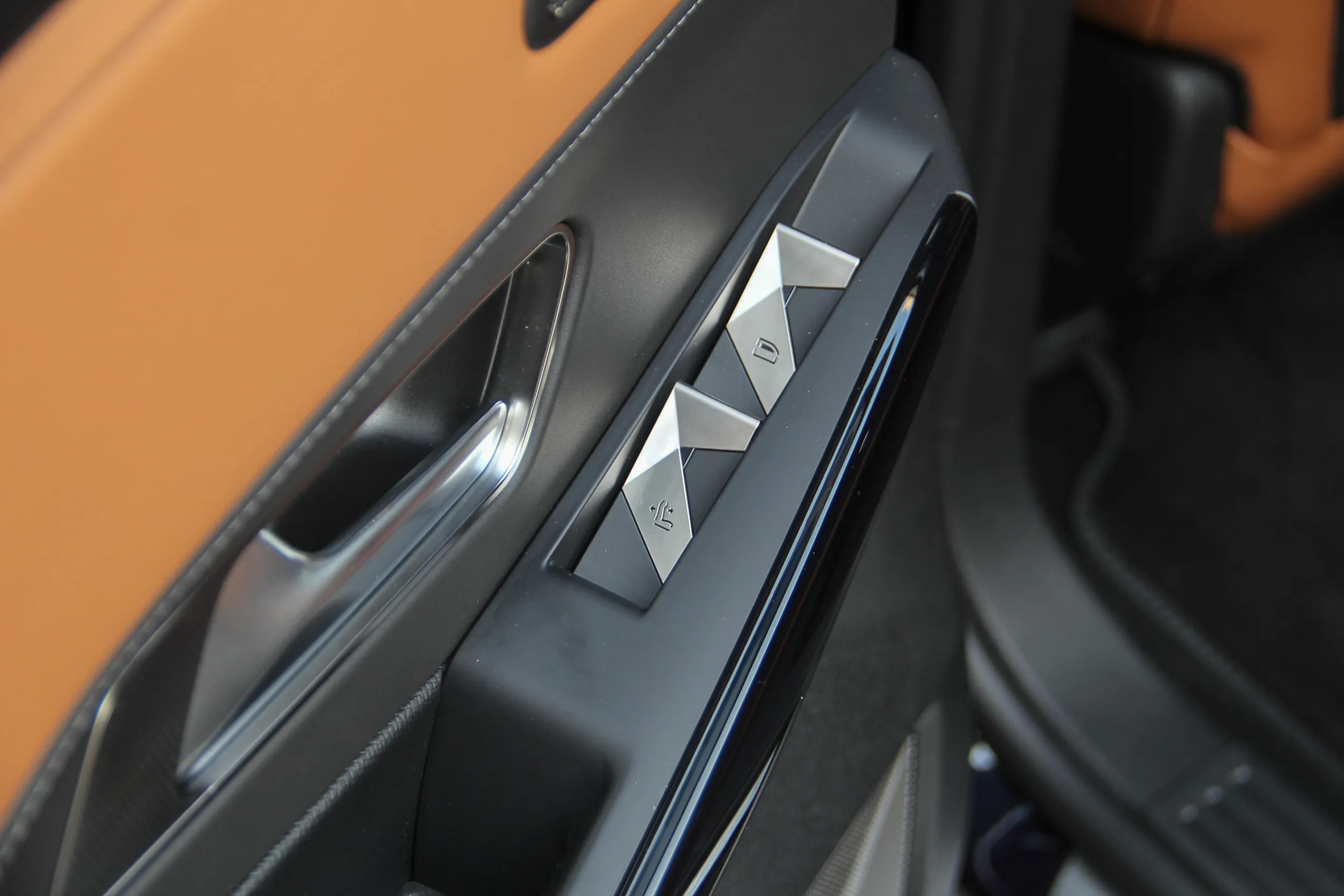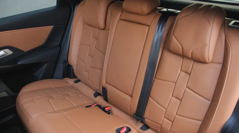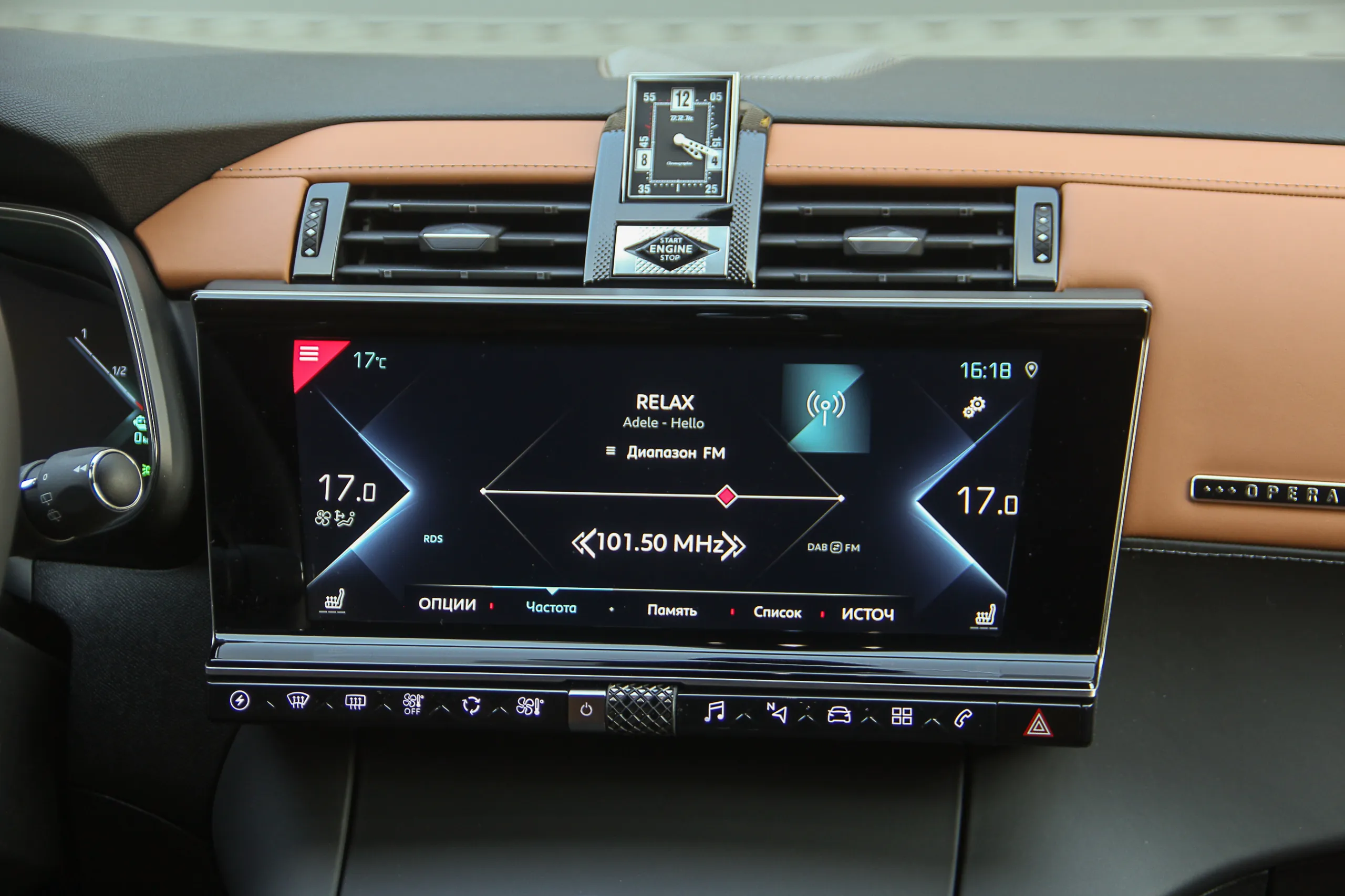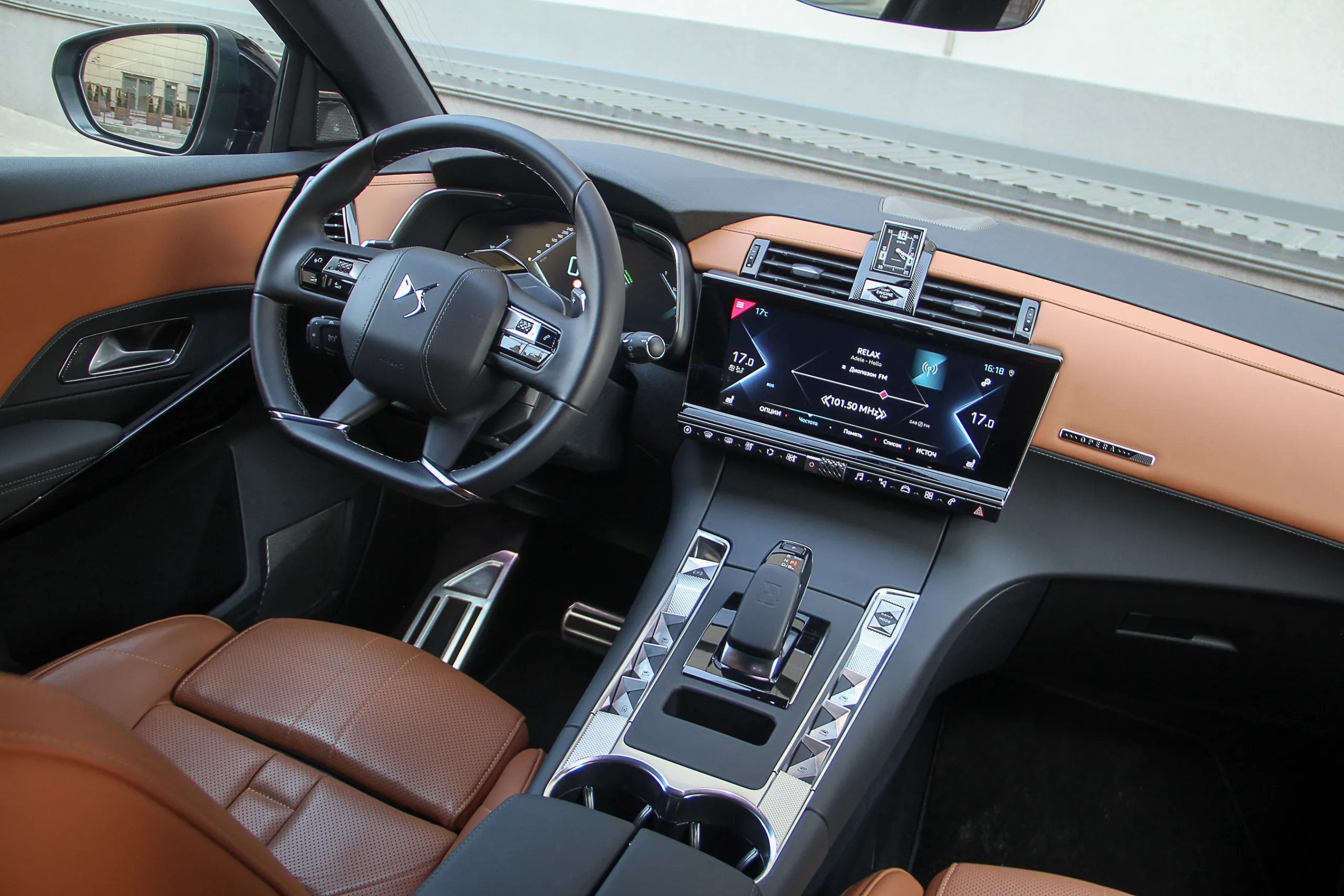 Тестовый DS 7 Crossback был в максимальной комплектации Grand Shic, к тому же еще и с некоторыми опциями (да-да, у вас всегда есть возможность дозаказать себе что-нибудь еще), поэтому в салоне выглядел очень нарядно. Светло-коричневой кожей наппа с перфорацией и фактурным пошивом (стилистически напоминает ремешок часов) отделаны не только сидения, но и частично передняя панель и дверные карты. На центральной консоли доминируют темные оттенки и это также преимущественно кожа.
