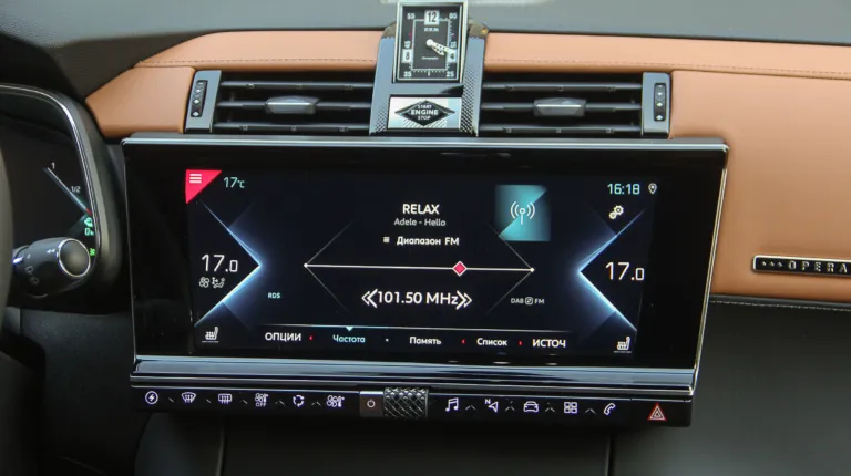 В салоне дизайнерская фантазия разошлась еще больше и поэтому дефлекторы, декоративные элементы, оформление приборной панели и даже клавиши и переключатели подчинены треугольному геометрическому рисунку! Добавляем вставки под металл, черный глянец, большой сенсорный экран мультимедийной системы и получаем представление о салоне DS 7 Crossback E-Tense. Впрочем, эта картина не будет полной без часов B.R.M. по центру торпедо, которые красиво открываются каждый раз при запуске двигателя. К слову, кнопка Старт находится тут же, прямо под ними.
