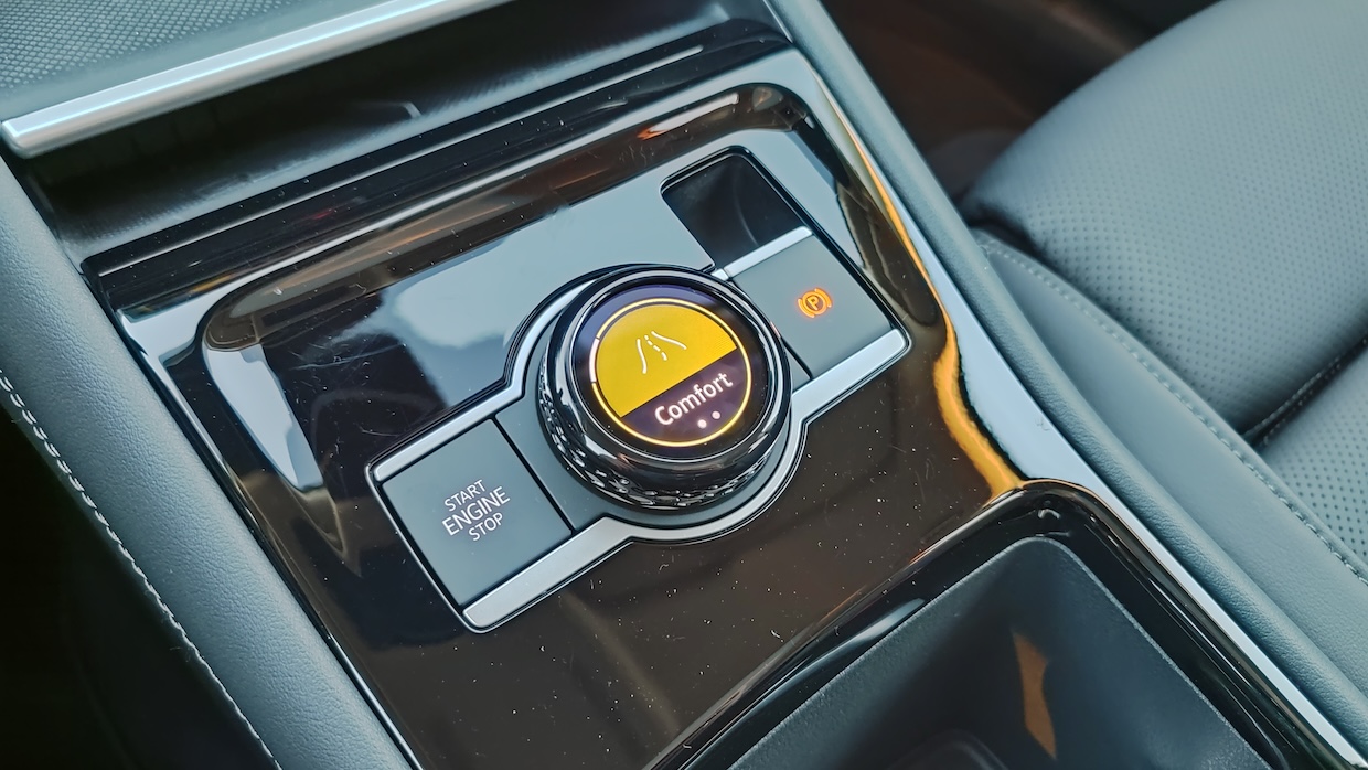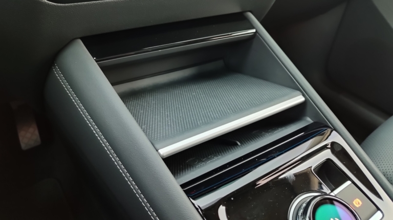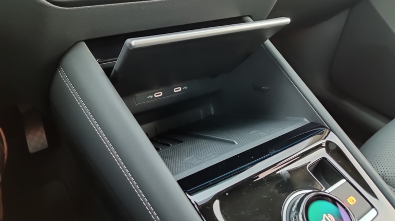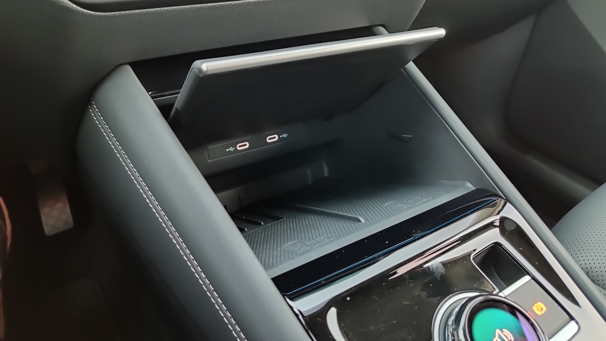 Внизу центральной консоли разместили полку для беспроводной зарядки сразу двух телефонов.Удобно, что она подвижна и полку можно приподнять, чтобы получить доступ к вещам под ней. Индукционная зарядная панель для смартфонов (мощность 15 Вт, да еще с охлаждением, чтобы телефон не перегревался во время зарядки) и двух портов USB-C (45 Вт).