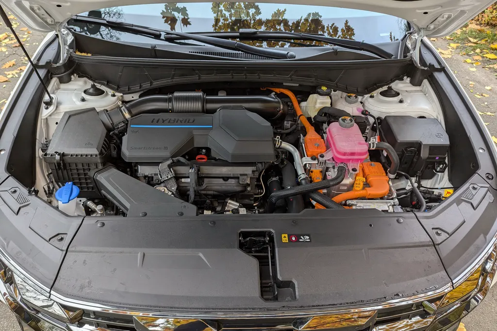 Внешне отличить гибридную версию от бензинового или дизельного Tucson можно только по лаконичной надписи Hybrid на багажнике. Поскольку это классический параллельный гибрид, а не PHEV, то никаких дополнительных люков кроме люка бензобака в нашем кроссовере нет. Под капотом тестового Tucson Hybrid расположился турбированный бензиновый двигатель Smartstream 1.6 T-GDi мощностью 160 л. и крутящим моментом 265 Нм, а также электромотором мощностью 65 л. Суммарная мощность данной силовой установки 215 л.с., а крутящий момент достигает 367 Нм. Двигатель имеет прямой впрыск топлива, турбонаддув и фирменную систему непрерывного изменения фаз газораспределения CVVD (Continuously Variable Valve Duration).