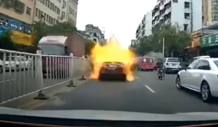 Toyota Camry взорвалась прямо во время движения в одном из китайских городов. К счастью, водитель не пострадал. Он покинул салон сразу после первого взрыва и отбежал на безопасное расстояние. По словам очевидцев, Тойота Камри была оснащена ГБО. Видимо, ее «кустарная» установка стала причиной взрыва.