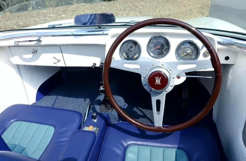 В салоне установлено большое рулевое колесо с деревянным ободом. Передняя панель окрашена в цвет кузова. Количество приборов и тумблеров минимально. Из-за необычно низкой крыши сиденья прикручены прямо к полу, но посадка и высадка все равно затруднена.