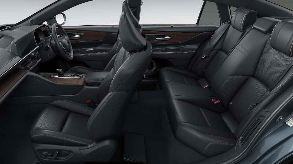 Построен седан Crown на той же платформе, что и Toyota Mirai, и Lexus LS. Он достигает в длину 5030 мм при колесной базе 3000 мм. Ширина и высота – 1890 и 1470 мм соответственно. Салон авто просторный и комфортный. В его оснащение вошли сиденья с электроприводом, вентиляцией и подогревом, цифровая приборная панель и современная мультимедийная система с крупным экраном. Отделка выполнена из кожи в сочетании с натуральным деревом.