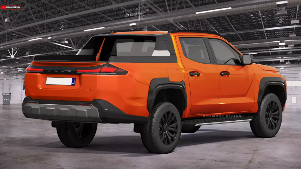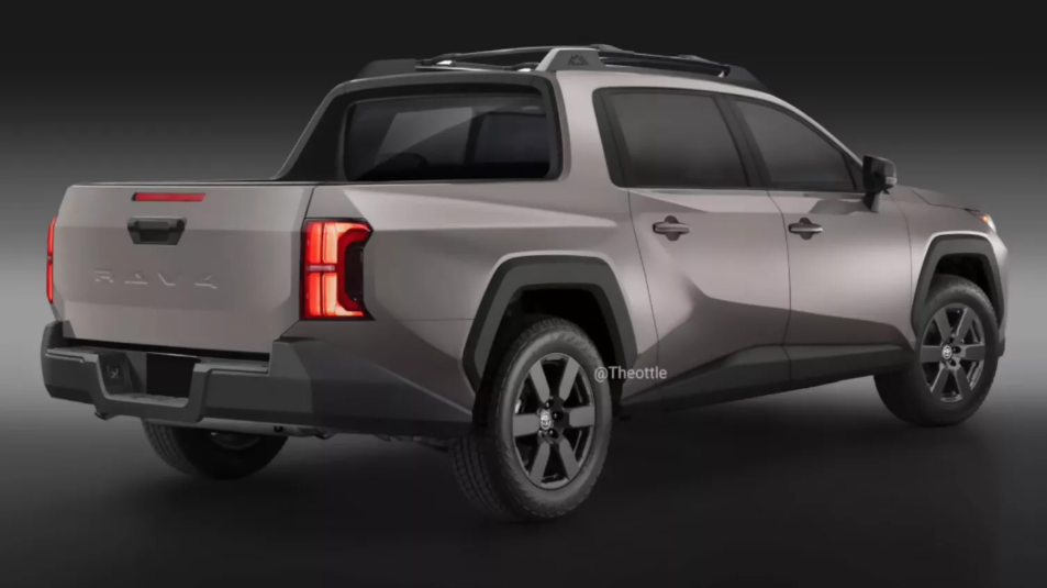 Дизайнеры предположили, как может выглядеть корма нового пикапа от Toyota. Его грузовая платформа короткая, но довольно вместительная. Задние фонари расположены вертикально, а в бампер интегрирована ступенька. Заднюю дверь дополняет надпись RAV4. Колеса у пикапа массивные и обуты во внедорожные шины. Еще можно отметить массивный обвес.