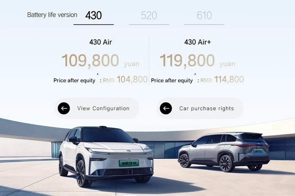 За эти деньги покупатель получает базовую версию bZ3X – 430 Air. Она поставляется с аккумуляторной батареей LFP емкостью 50 кВт-ч, которая обеспечивает запас хода по циклу CTLC до 430 км. Следующая в иерархии версия 430 Air+ с расширенным базовым оснащением обойдется в $16500.