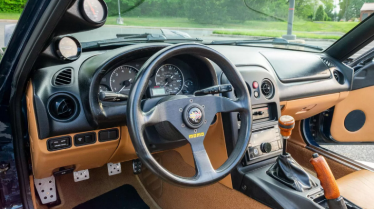 Модификации продолжились под капотом этого родстера. В листинге указано, что 1,8-литровый двигатель был дополнен турбокомпрессором. Его мощность после доработки неизвестна, но она передается на задние колеса через шестиступенчатую механическую коробку передач.