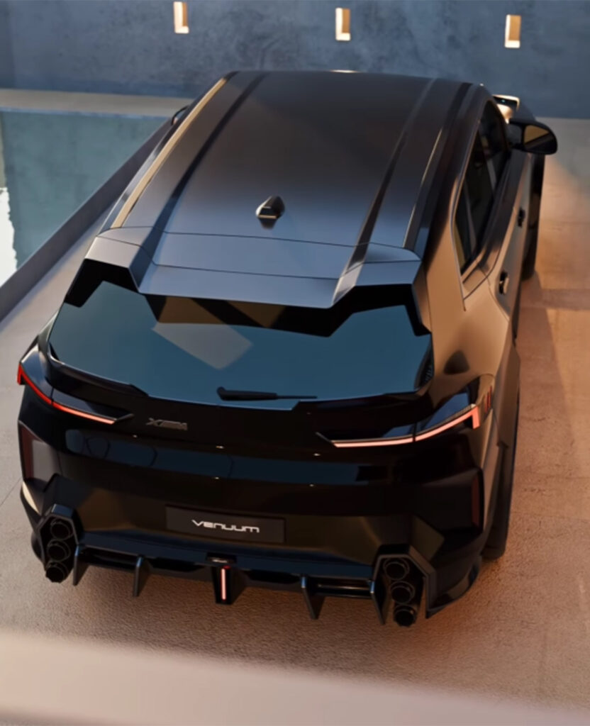 Существенные изменения внесены и в заднюю часть кузова. Наиболее очевидные — большой спойлер, выступающий из крыши, и два больших спойлера на багажной двери. Также Venuum разработала для кроссовер смелый диффузор и добавила две выхлопные трубы. Таким образом, у тюнингованного BMW XM выхлопов целых шесть. При этом под капотом все осталось по-прежнему.