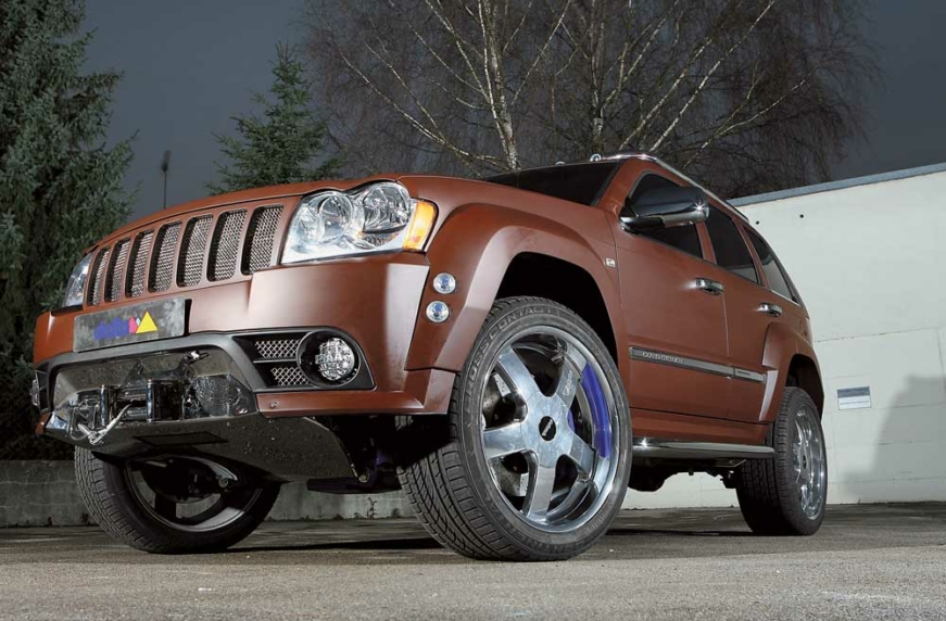 Заводскую «заряженную» топ-модель Jeep Grand Cherokee SRT-8 можно сделать еще эффектней, уверены специалисты австрийской фирмы Konigseder. Как известно, американцы страдают гигантоманией, поэтому неудивительно, что все в этом модифицированном внедорожнике огромных размеров. Так, например, стильные хромированные диски модели Milane 721 имеют диаметр 24 дюйма, а их оригинальный дизайн обеспечивает отличное охлаждение тормозных механизмов. Массивный аэродинамический обвес сделан по канонам спортивных машин: широкая юбка по периметру кузова, «пухлые» расширители колесных арок с дополнительными воздухозаборниками и, конечно же, необычной формы двухкомпонентное заднее антикрыло (почти как на гоночных болидах) на пятой двери. Кроме версии SRT-8, такой обвес можно установить и на обычные варианты Jeep Grand Cherokee.