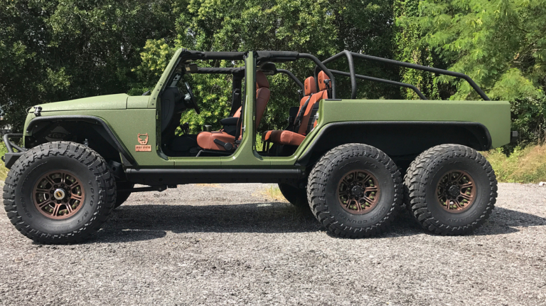 Кузов Jeep Wrangler пришлось удлинить в задней части, чтобы поставить еще один ведущий мост. Машина получила усиленную переднюю подвеску, увеличенный дорожный просвет и металлические бамперы. Эффектные шины увеличенного размера Toyo украшают легкосплавные диски.