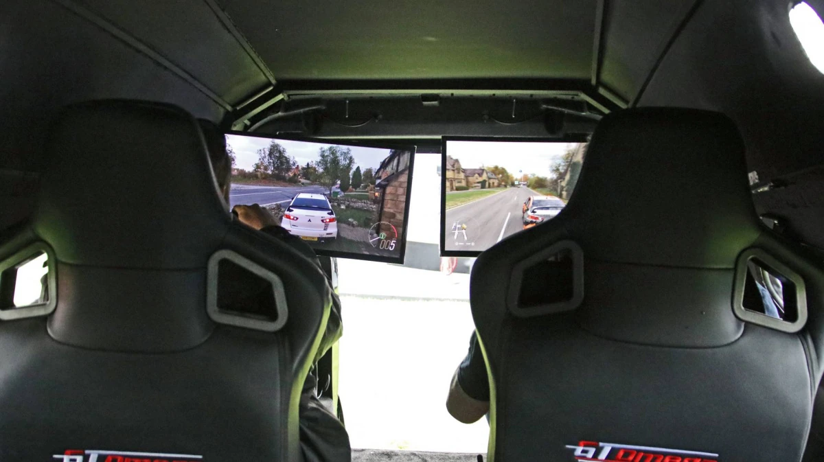 Перед креслами установлена два изогнутых 24-дюймовых LED-монитора. Интересно, что еще два монитора поменьше – на 22 дюйма установлены снаружи автомобиля, специально для зрителей. Для игроков и зрителей есть также кофемашина и бар с холодильником.