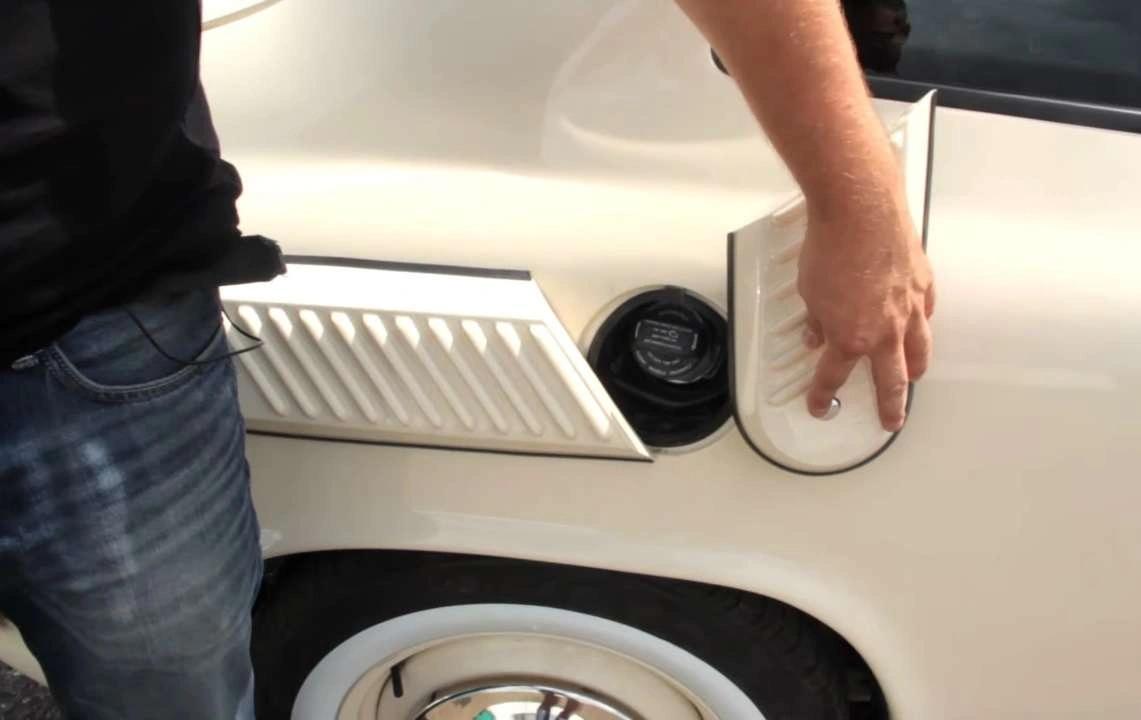 Задние фонари с бесцветными плафонами также выдержаны в стиле ретро. А реализация заправочной горловины просто сумасшедшая – она скрывается под псевдо-воздухозаборником на правом заднем крыле.