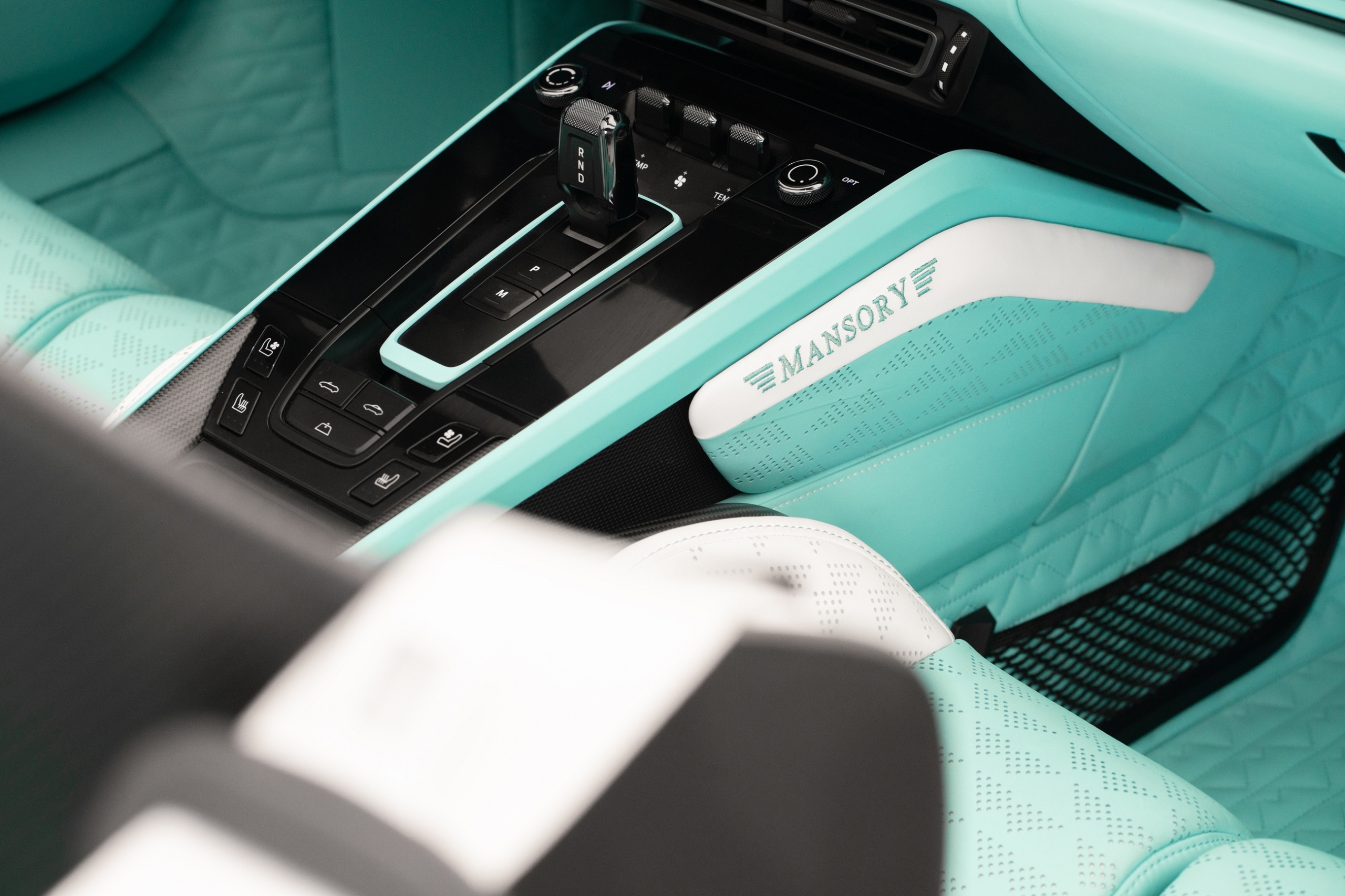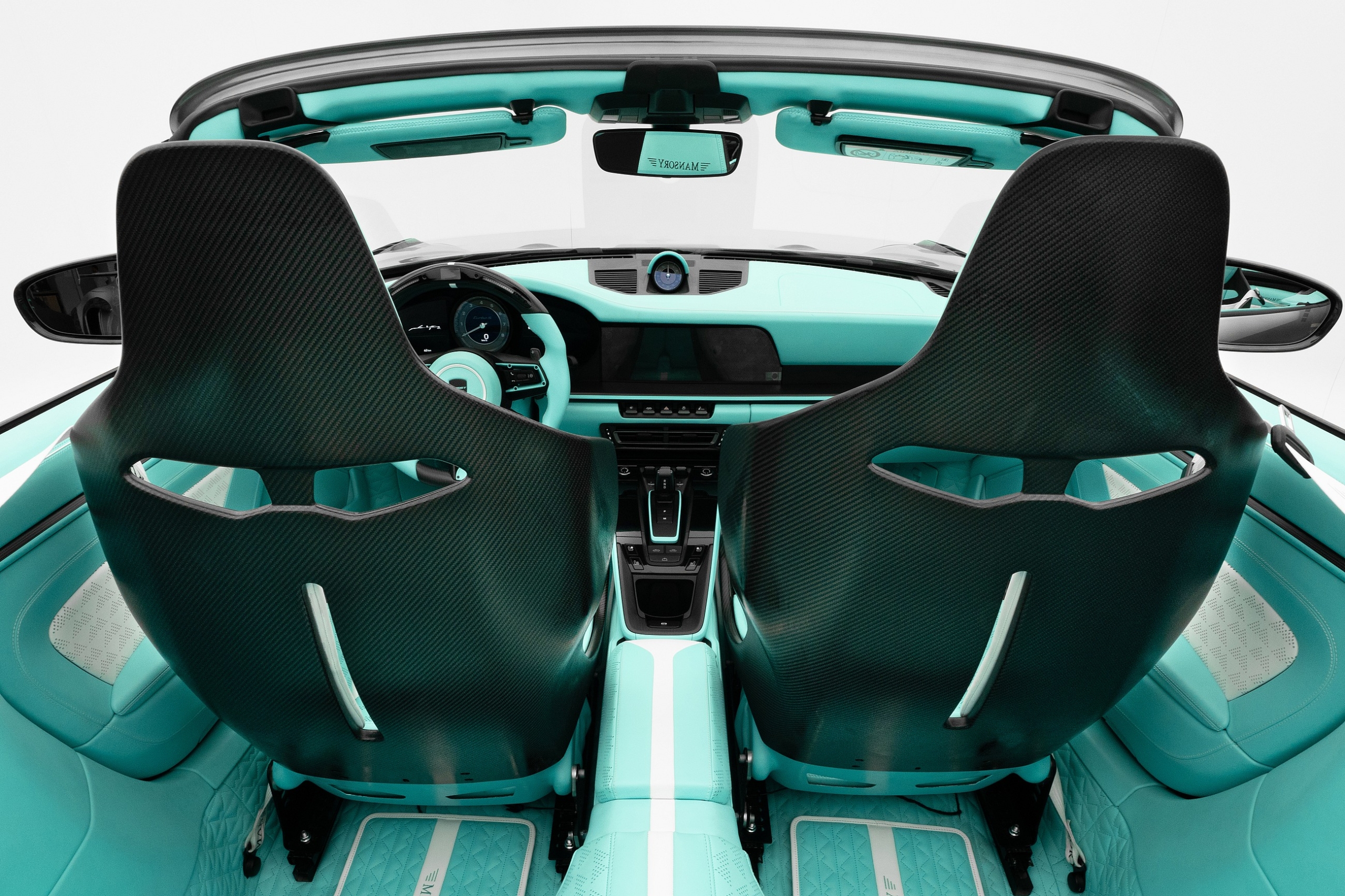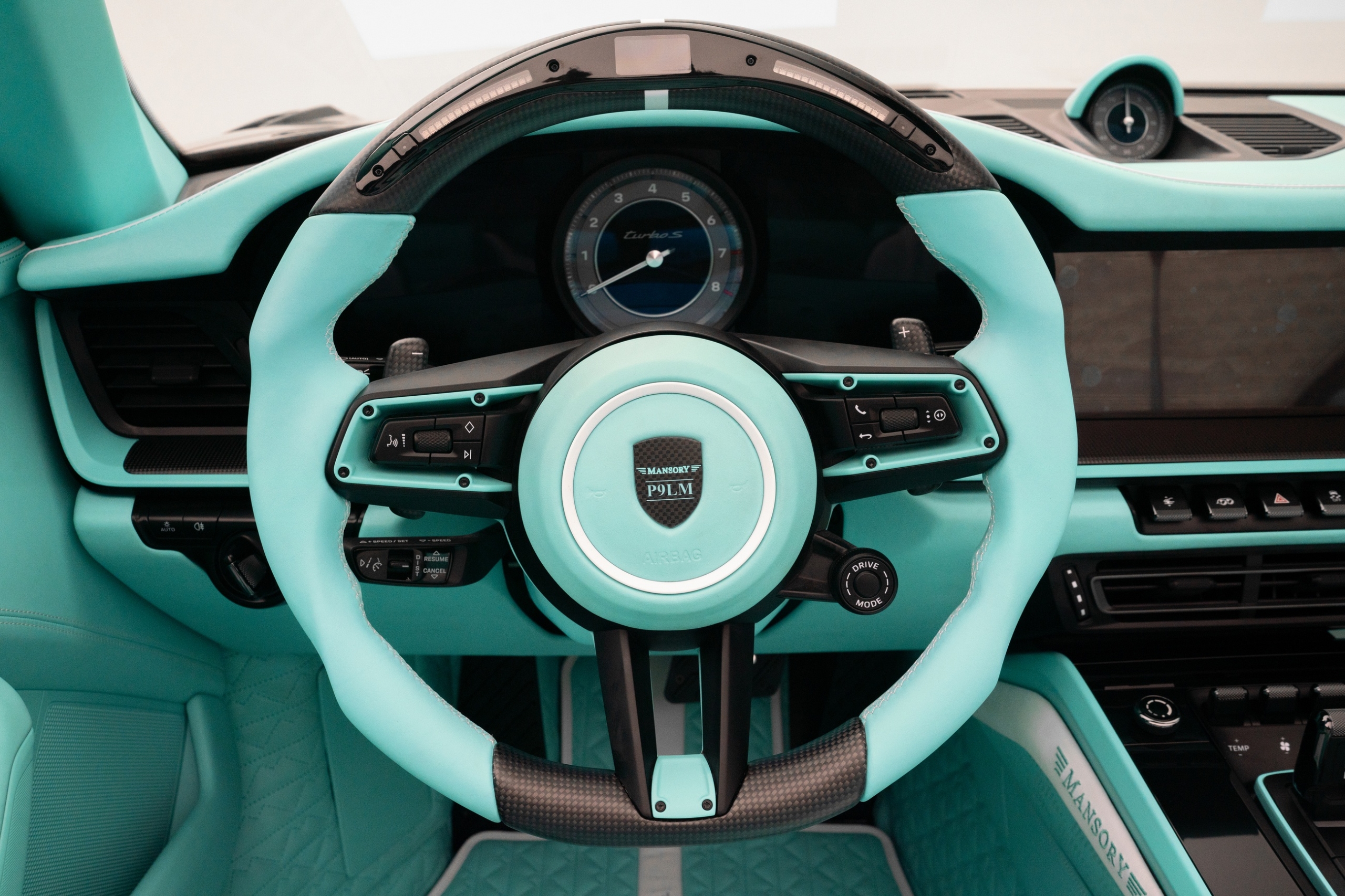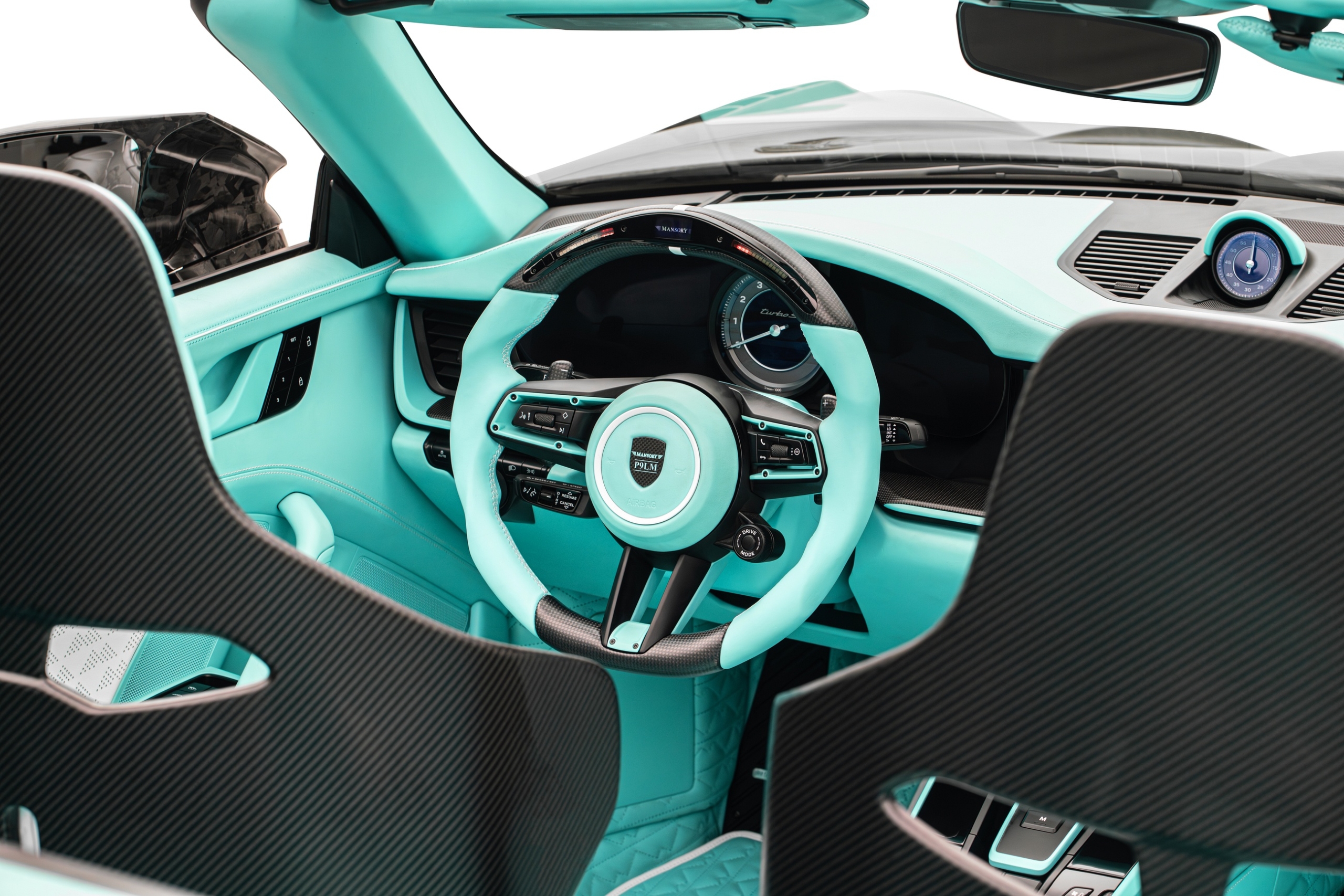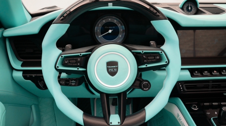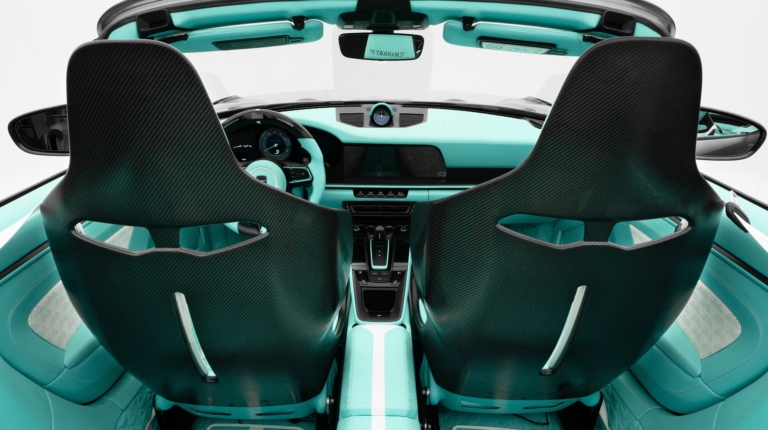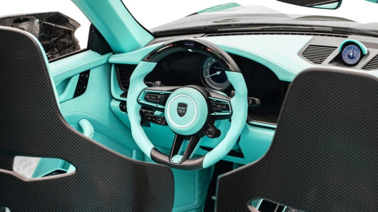 Полностью переработанный салон укомплектован карбоновыми спортивными сиденьями. Рулевое колесо отделано наполовину кожей, наполовину карбоном. Боковые спицы руля окрашены в цвет кожи. В верхней части обода расположены индикатор переключения передач и цифровой дисплей скорости и оборотов двигателя. Клиент сможет выбрать цвет кожи, декоративной строчки и карбоновые аппликации. Также тюнер изготовил «фирменные» напольные коврики и ремни безопасности с собственным логотипом.