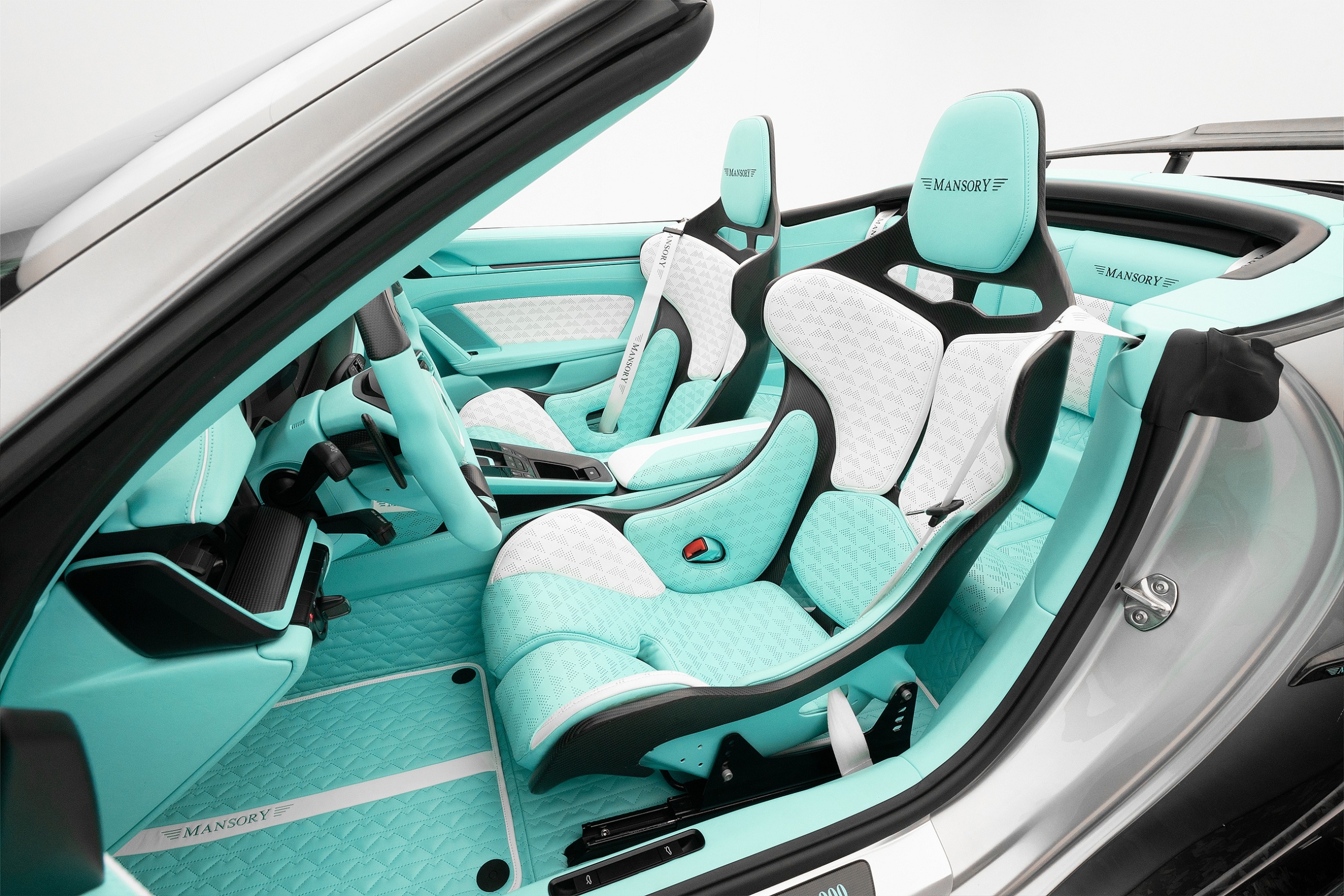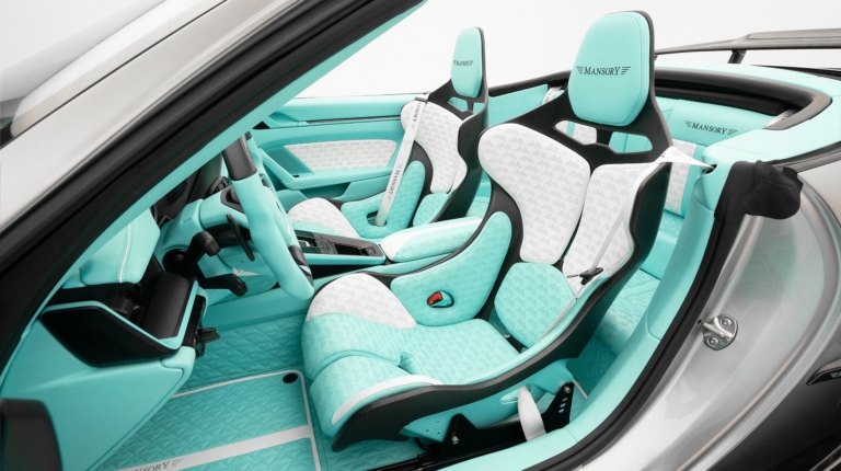 Также из голого карбона у кабриолета капот, расширители колесных арок и вентиляционные отверстия в крыльях. На боковинах — надпись «MANSORY». Плюc к этому заявлены новая трехтрубная выхлопная система и особые колесные диски со спортивными шинами.