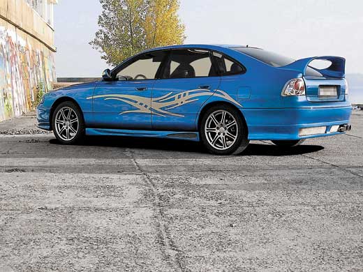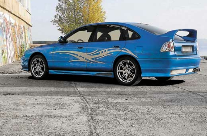 благодаря нарощенным бамперам, юбкам на порогах, капоту в