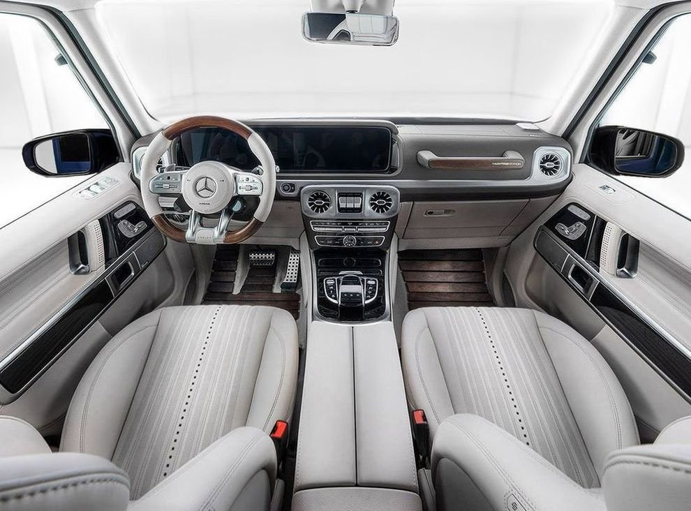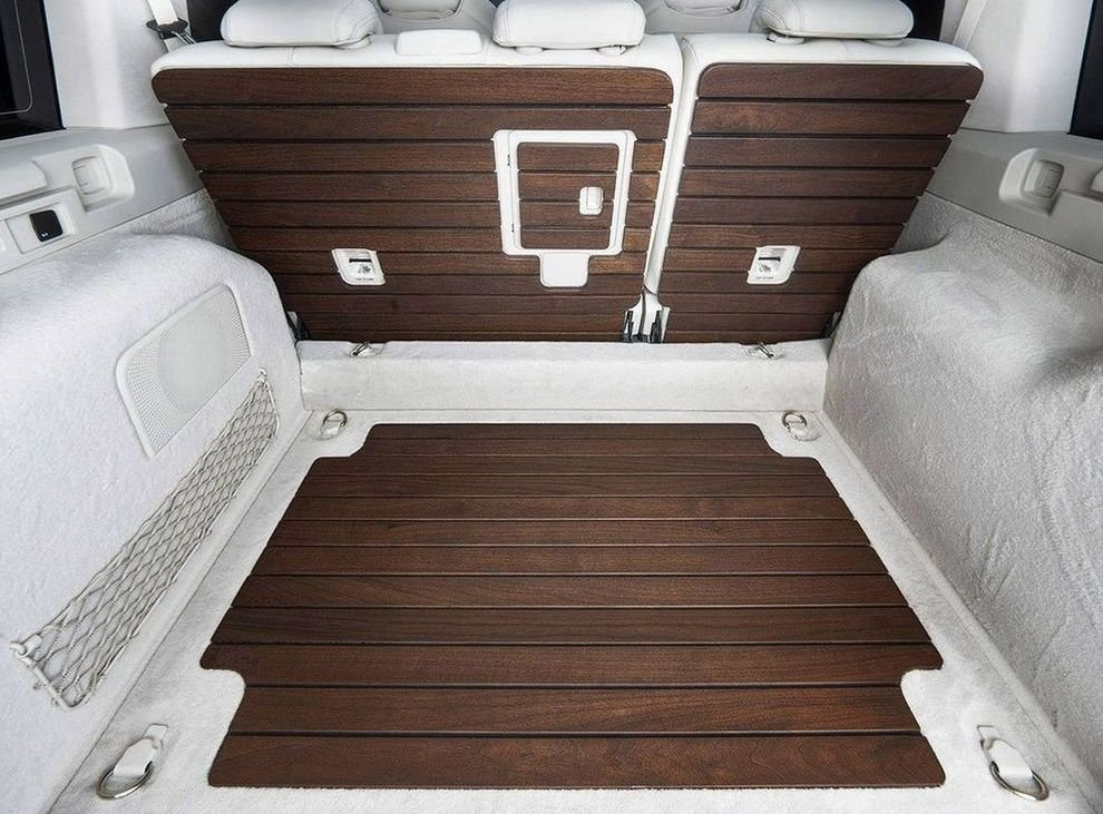 Салон внедорожника отделан дорогой светлой кожей. В частности, ее можно увидеть на креслах и дверных картах. Дверные стойки, потолок и багажное отделение обшили алькантарой. На рулевом колесе, передней панели, спинках сидений заднего ряда и в багажнике вставки из натурального дерева. Также деревянными панелями заменили напольные коврики.