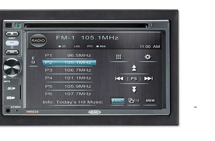 Мультимедийный ресивер Jensen VM 9224R скомпонован в духе времени: по получающей все большее распространение схеме типоразмера 2 DIN с чуть усеченным сенсорным экраном и несколькими удобными «реальными» органами управления слева от него.