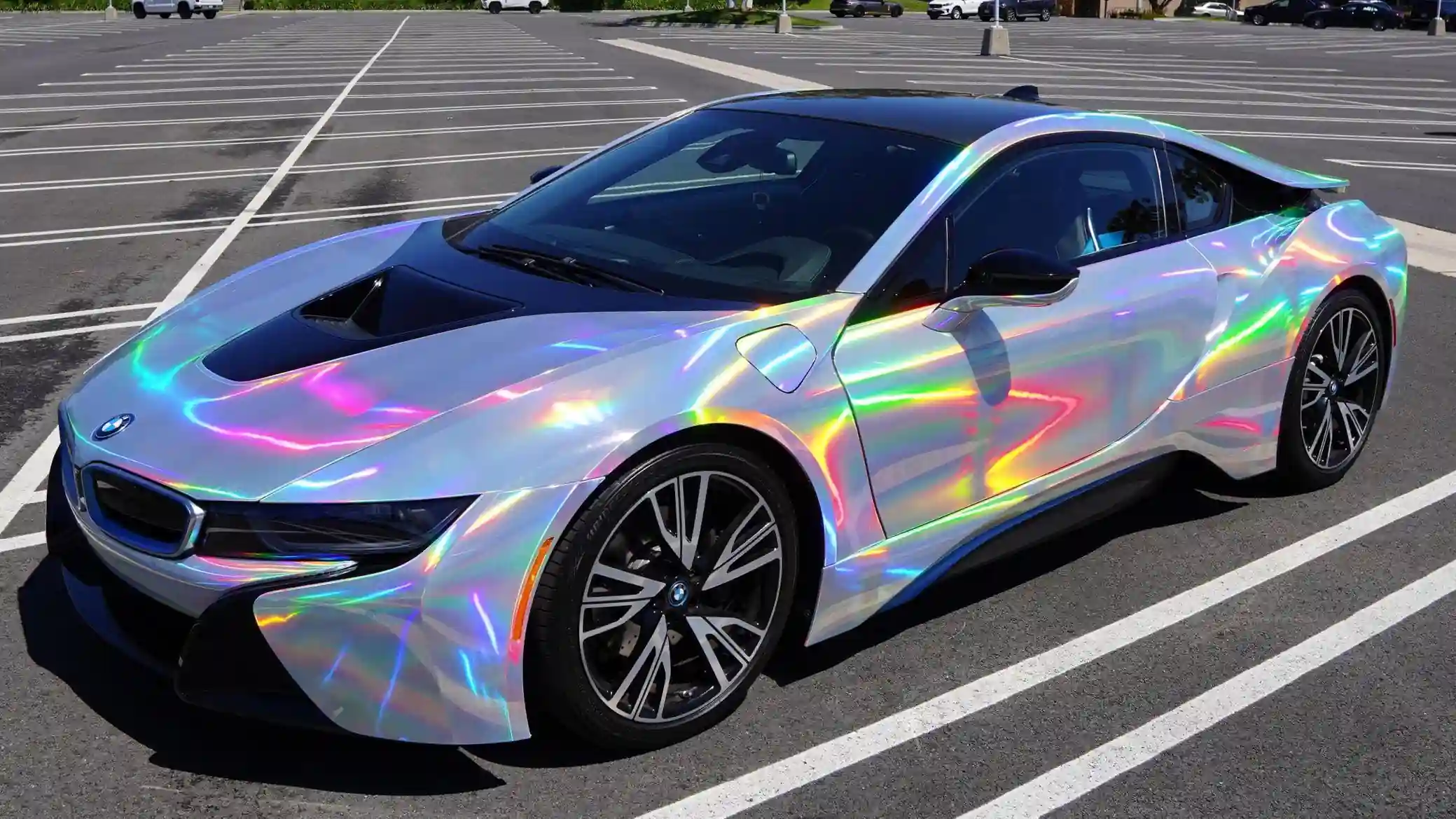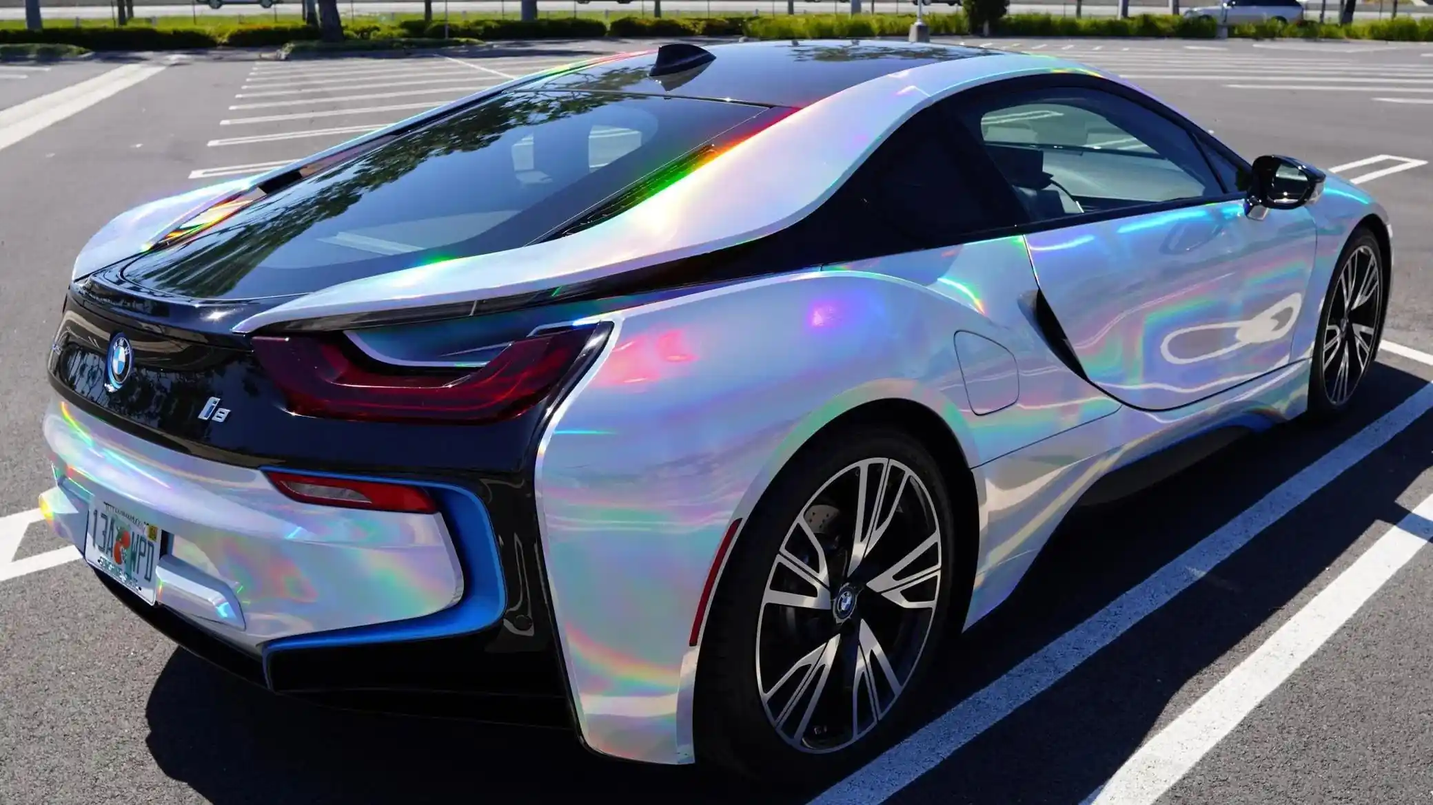 Автомобильный аукцион Cars & Bids из Калифорнии продает уникальный BMW i8 2015 года. Особенность гибридной «двухдверки» — голографическая пленка на кузове. Появление такого сверкающего автомобиля на дороге вряд ли порадует остальных водителей, но незамеченным он точно не останется.