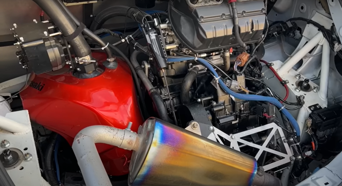Чтобы получившаяся система работала, он состыковал родную трансмиссию с секвентальной коробкой от мотоцикла. На заднюю ось установил полуосевой дифференциал. Удерживает мощный двигатель задний подрамник от Lexus IS350.