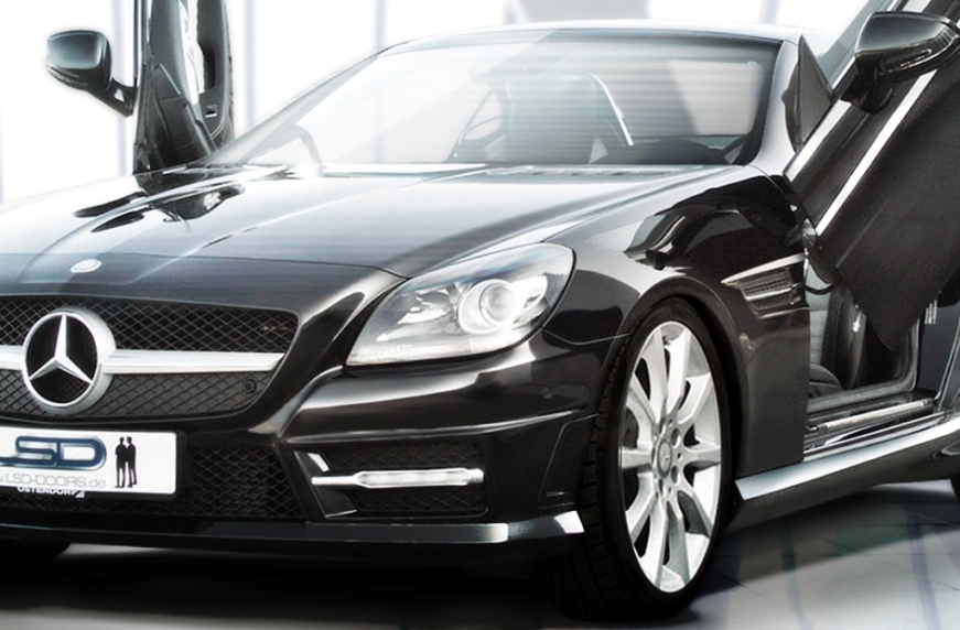 Мастерская LSD (Lambo style doors) подготовила новый комплект поднимающихся вверх дверей для третьего поколения Mercedes-Benz SLK. Специалисты компании – создатели новых ламбо-дверей – акцентируют внимание на том, что ими уделено особое внимание упрощению процесса открывания-закрывания дверей и их лучшей стабильности в открытом положении. В шарнирах, крепящихся, кстати, на штатные места «мерседесовского» кузова, кроме фирменных для компании LSD роликовых направляющих в этот раз применен дополнительный механизм блокировки. Дверь открывается по такому алгоритму: сначала она немного «выезжает» из дверного проема на пассажира, затем сама поднимается вверх. Компания напоминает, что монтаж ее продукта на машину никаким образом негативно не влияет на безопасность – в том числе и на результаты краш-тестов автомобиля, которые проводились как с классическими дверями, так и с вертикальными, разработанными инженерами компании Lambo style doors.