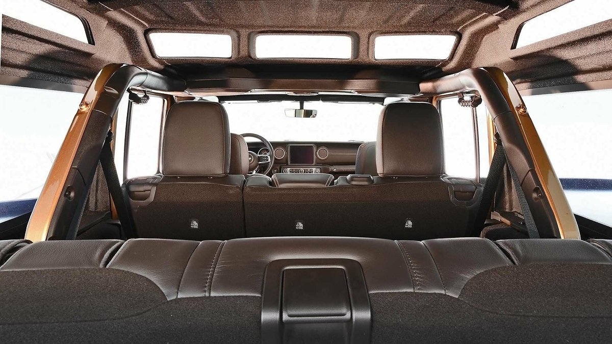 Второй – трехрядный Wrangler Overlook SEMA Concept. Для того, чтобы установить третий ряд сидений, тюнеры растянули кузов внедорожника на 300 мм. В списке доработок дополнительные задние окошки на корме, 51-миллиметровый лифт-комплект и грязевые шины BFGoodrich KM3 размерности 37 дюймов.