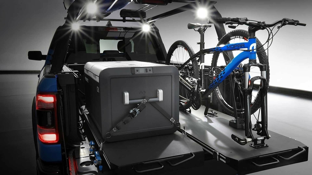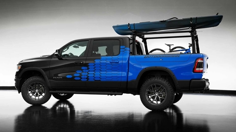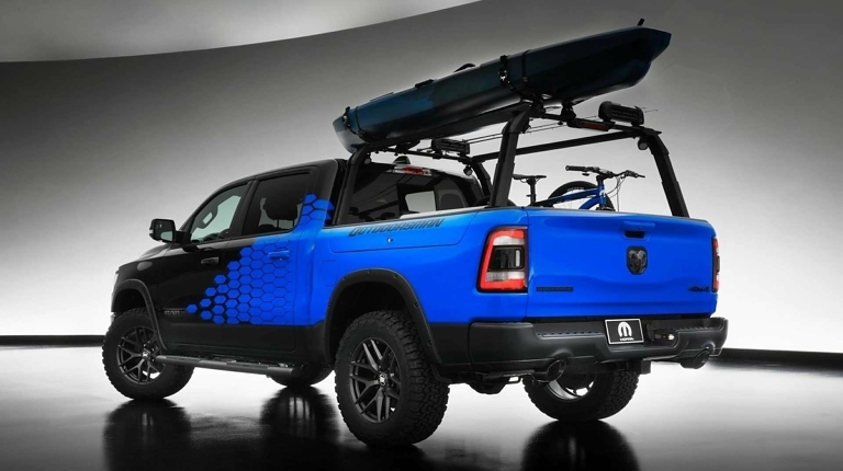 Еще один пикап – Ram 1500 Outdoorsman SEMA – в Mopar подготовили для транспортировки различных приспособлений и инструментов. В частности, в грузовой платформе появился стеллаж для перевозки крупногабаритных предметов (лестниц, байдарок). На бортах установили крепления для спортивного снаряжения и различных инструментов.