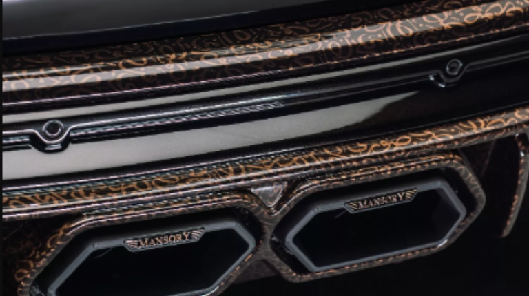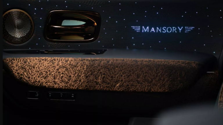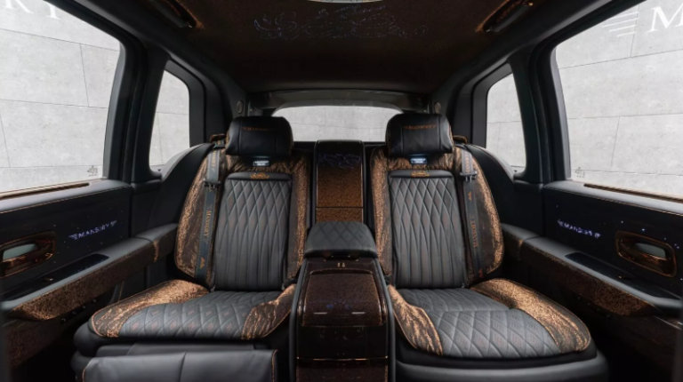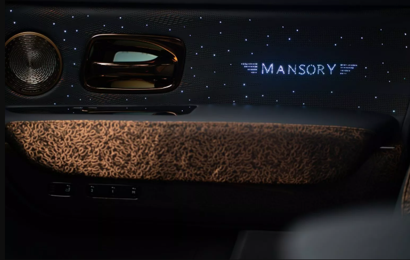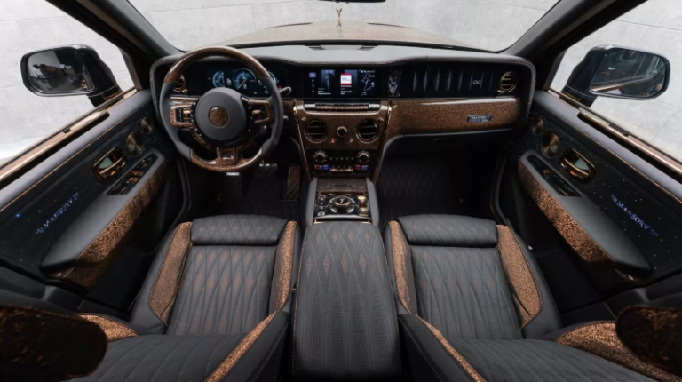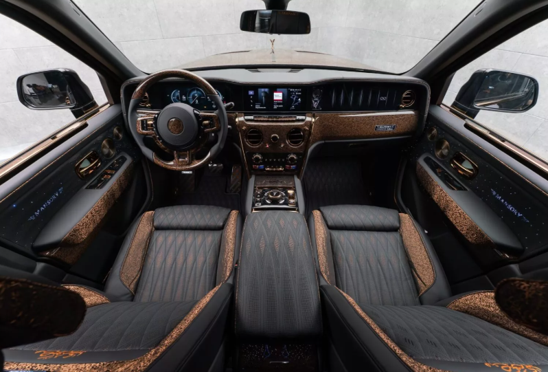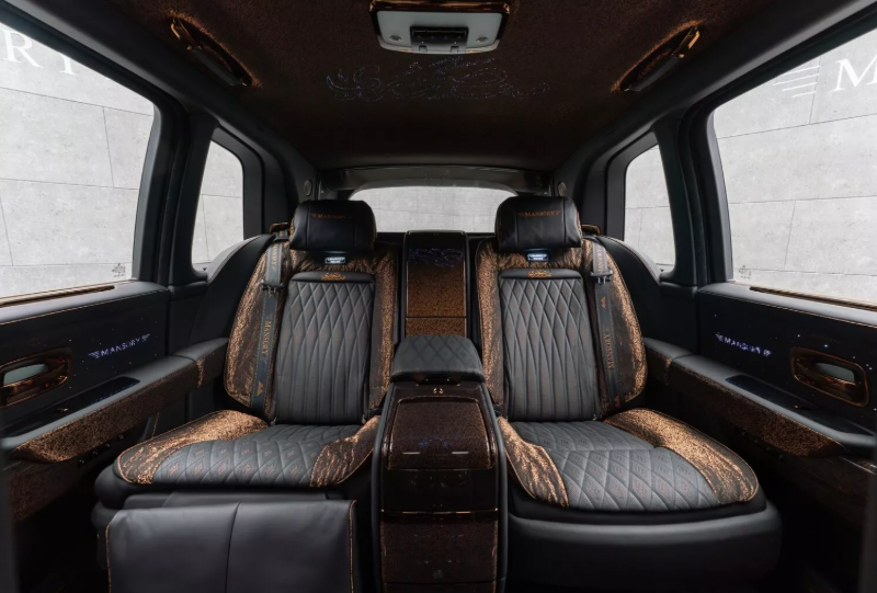 Салон Rolls-Royce Cullinan также переработали, оформив его в восточном стиле. Его отделку выполнили из премиальной кожи черного и коричневого цветов с арабскими буквами. В качестве акцентов специалисты Mansory использовали вставки из велюра, натурального дерева и карбона. Еще есть подсвеченные логотипы ателье и диодный узор на потолке.