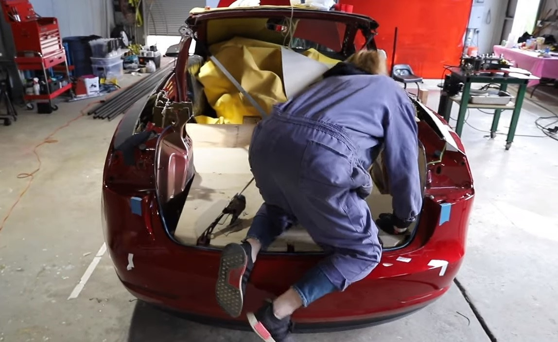 Пожалуй, процесс конвертации вы себе представляете верно. Необходимо очистить внутренее пространство задней части салона, затем отрезать верхнюю часть кузова после средней стойки. Необходимо усилить шасси и придумать новую дверцу багажника. Назвали все это Truckla — что-то вроде Грузовикла. Адаптировали как могли, sorry.