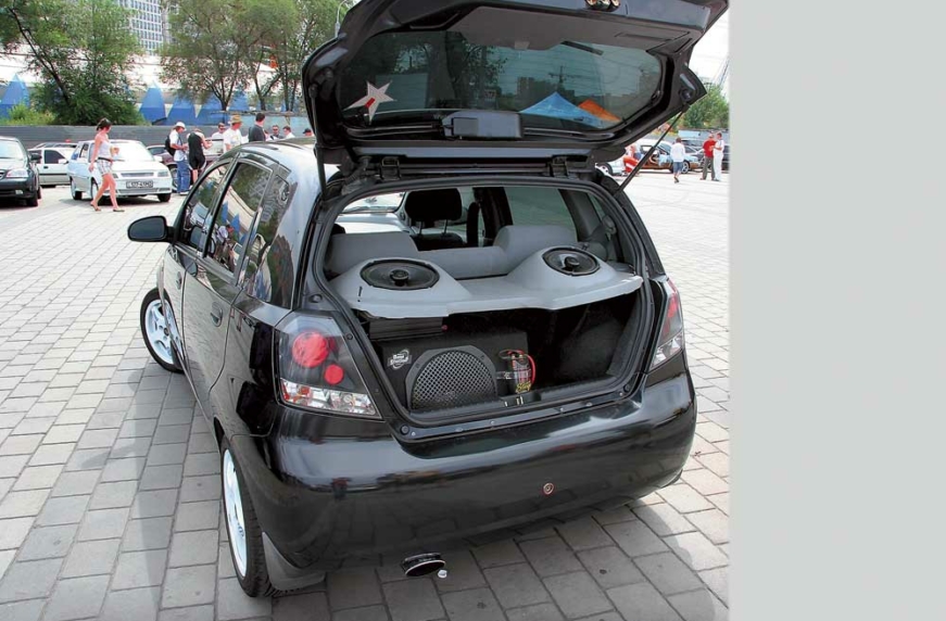 Автомобиль как будто специально сделали, чтобы возить в нем шпионскую аппаратуру. Прятать за густо тонированными cтеклами микрофоны, магнитофоны, мощные объективы и прочий джеймсбондовский арсенал. Кстати, какая-то странного назначения коробочка там действительно есть. Однако, не посягая на чужие секреты, отметим, что в скромном объеме хэтчбека поместили развитую аудиосистему. При этом не затратили много средств, не перестраивали радикально элементы салона, да еще и привлекательность интерьера сохранили.