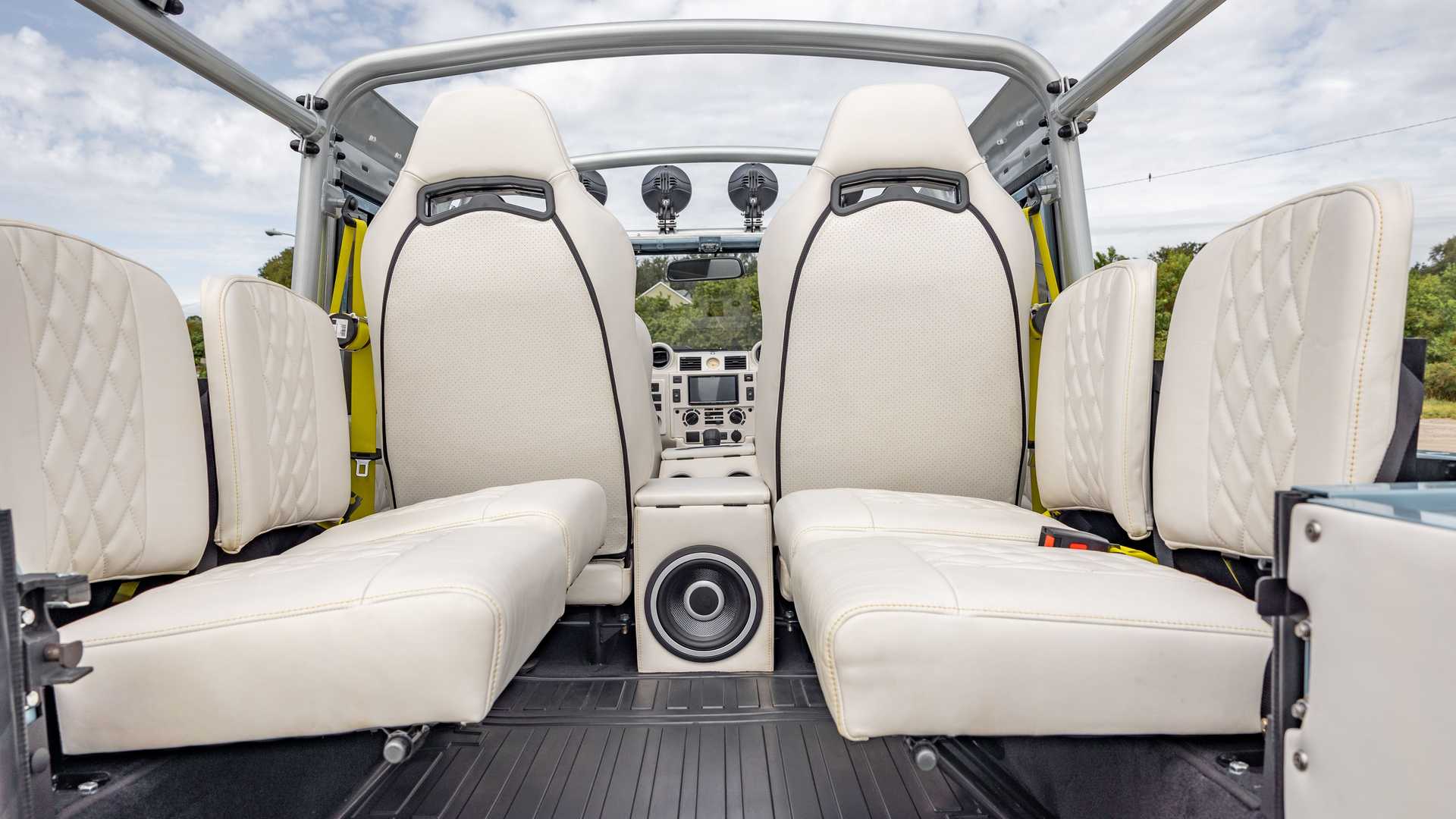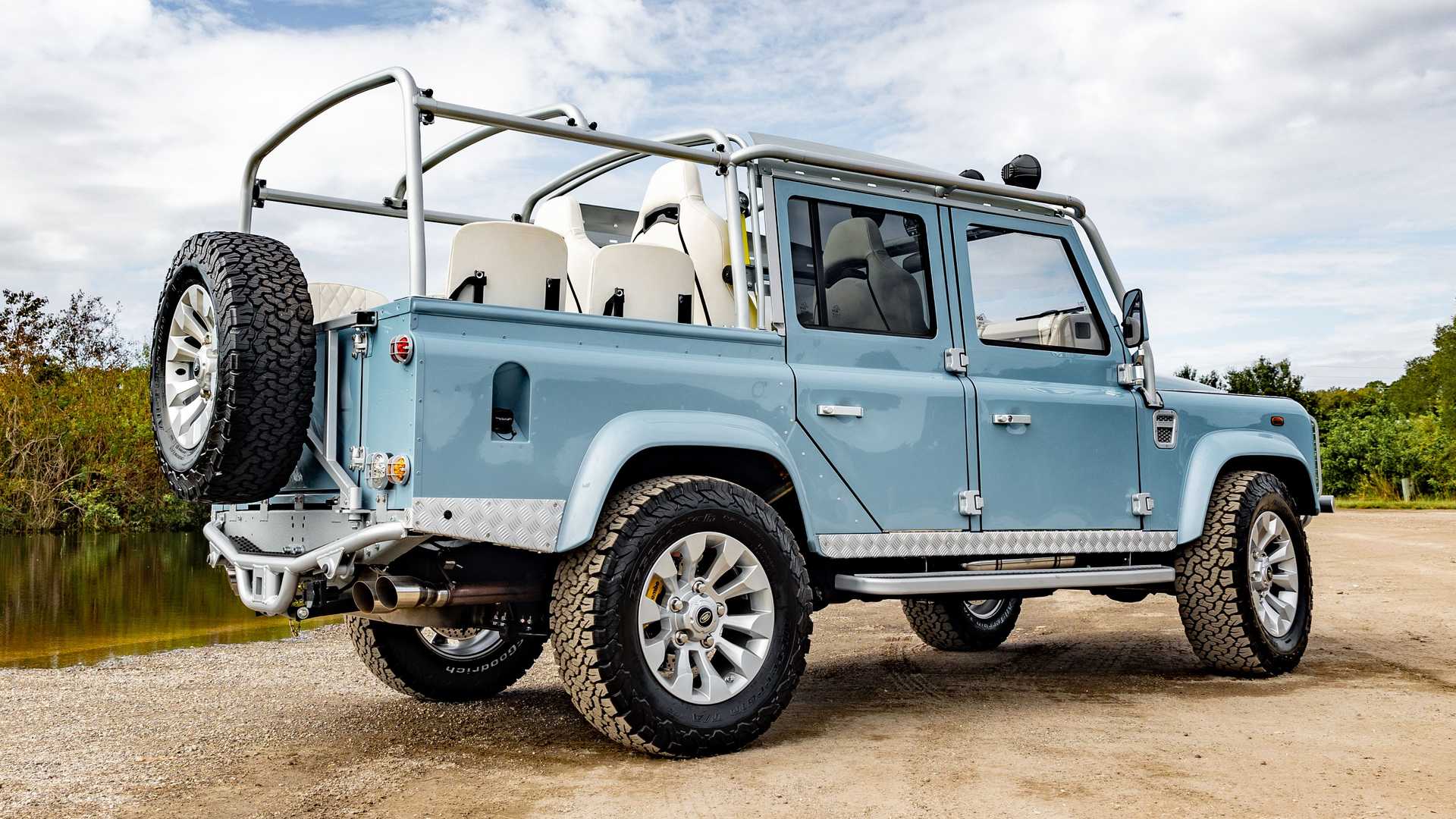 Кузов пикапа окрашен в оттенок Frozen Blue от Porsche. Съемная крыша изготовлена из белого винила. Также ретомод получил сетчатую металлическую решетку радиатора, массивный силовой бампер, защитный каркас лобового стекла и металлические дверные пороги. Ездит кастомный Defender 110 на 18,0-дюймовых десятиспицевых колесных дисках с 33,0-дюймовыми внедорожными шинами BF Goodrich. За ними спрятаны тормозные суппорты Brembo, окрашенные в фирменный желтый оттенок Ferrari.